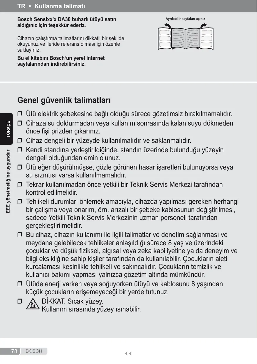 Bosch Sensixx'x DA30 buharli ütüyü satin Ayniabilir sayfalan açinz aldiÿiniz için tesekkür ederiz.