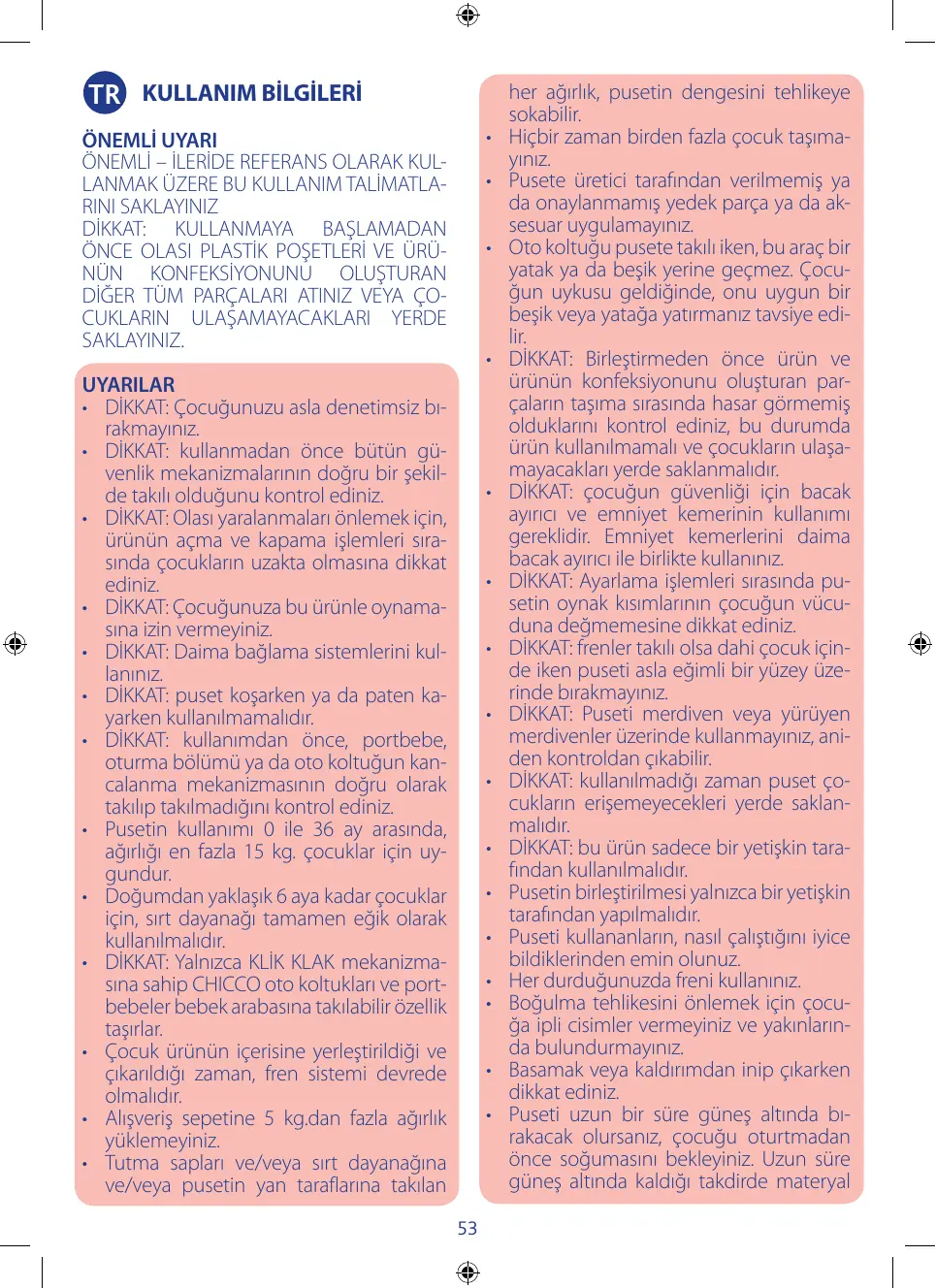 UYARILAR • DİKKAT: Çocuğunuzu asla denetimsiz bırakmayınız. • DİKKAT: kullanmadan önce bütün güvenlik mekanizmalarının doğru bir şekilde takılı olduğunu kontrol ediniz. • DİKKAT: Olası yaralanmaları önlemek için, ürünün açma ve kapama işlemleri sırasında çocukların uzakta olmasına dikkat ediniz. • DİKKAT: Çocuğunuza bu ürünle oynamasına izin vermeyiniz. • DİKKAT: Daima bağlama sistemlerini kullanınız. • DİKKAT: puset koşarken ya da paten kayarken kullanılmamalıdır. • DİKKAT: kullanımdan önce, portbebe, oturma bölümü ya da oto koltuğun kancalanma mekanizmasının doğru olarak takılıp takılmadığını kontrol ediniz. • Pusetin kullanımı 0 ile 36 ay arasında, ağırlığı en fazla 15 kg. çocuklar için uygundur. • Doğumdan yaklaşık 6 aya kadar çocuklar için, sırt dayanağı tamamen eğik olarak kullanılmalıdır. • DİKKAT: Yalnızca KLİK KLAK mekanizmasına sahip CHICCO oto koltukları ve portbebeler bebek arabasına takılabilir özellik taşırlar. • Çocuk ürünün içerisine yerleştirildiği ve çıkarıldığı zaman, fren sistemi devrede olmalıdır. • Alışveriş sepetine 5 kg.dan fazla ağırlık yüklemeyiniz. • Tutma sapları ve/veya sırt dayanağına ve/veya pusetin yan taraflarına takılan