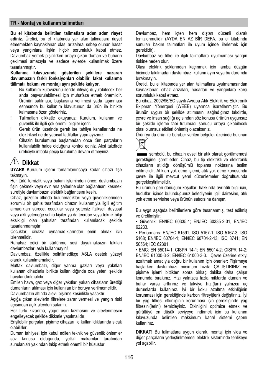 TR - Montaj ve kullanım talimatları Davlumbaz, hem içten hem dıştan düzenli olarak temizlenmelidir (AYDA EN AZ BİR DEFA, bu el kitabında sunulan bakım talimatları ile uyum içinde ilerlemek için gereklidir). Davlumbaz ve filtre ile ilgili talimatlara uyulmaması yangın riskine neden olur. Olası elektrik şoklarından kaçınmak için lamba düzgün biçimde takılmadan davlumbazı kullanmayın veya bu durumda bırakmayın. Üretici, bu el kitabında yer alan talimatlara uyulmamasından kaynaklanan cihaz arızaları, hasarları ve yangınlara karşı sorumluluk kabul etmez. Bu cihaz, 2002/96/EC sayılı Avrupa Atık Elektrik ve Elektronik Ekipman Yönergesi (WEEE) uyarınca işaretlenmiştir. Bu ürünün uygun bir şekilde atılmasını sağladığınız takdirde, çevre ve insan sağlığı açısından söz konusu ürünün uygunsuz bir şekilde işleme tabi tutulması sonucu ortaya çıkabilecek olası olumsuz etkileri önlemiş olacaksınız. Ürün ya da ürün ile beraber verilen belgeler üzerinde bulunan Bu el kitabında belirtilen talimatlara adım adım riayet ediniz. Üretici, bu el kitabında yar alan talimatlara riayet etmemekten kaynaklanan olası arızalara, sebep olunan hasar veya yangınlara ilişkin hiçbir sorumluluk kabul etmez. Davlumbaz yemek pişirilirken ortaya çıkan duman ve buharın çekilmesi amacıyla ve sadece evlerde kullanılmak üzere tasarlanmıştır. Kullanma kılavuzunda gösterilen şekillere nazaran davlumbazın farklı fonksiyonları olabilir, fakat kullanma tâlimatı, bakımı ve montajı aynı şekilde kalıyor. Bu kullanım kulavuzunu ileride ihtiyaç duyulabilecek her anda başvurulabilmesi için muhafaza etmek önemlidir. Ürünün satılması, başkasına verilmesi yada taşınması esnasında bu kullanım klavuzunun da ürün ile birlikte kalmasına özen gösteriniz. Talimatları dikkatle okuyunuz: Kurulum, kullanım ve güvenlik ile ilgili çok önemli bilgiler içerir. Gerek ürün üzerinde gerek ise tahliye kanallarında ne elektriksel ne de yapısal tadilatlar yapmayızınız. Cihazin kurulumuna başlamadan önce tüm parçaların kullanılabilir halde olduğunu kontrol ediniz. Aksi takdirde üreticiyle irtibata geçip kuruluma devam etmeyiniz. sembolü, bu cihazın evsel bir atık olarak görülmemesi gerektiğine işaret eder. Cihaz, bu tip elektrikli ve elektronik cihazların atıldığı dönüşümlü toplama noktasına teslim edilmelidir. Atıkları yok etme işlemi, atık yok etme konusunda çevre ile ilgili mevcut yerel düzenlemeler doğrultusunda gerçekleştirilmelidir. Bu ürünün geri dönüşüm koşulları hakkında ayrıntılı bilgi için, hudutları içinde bulunduğunuz belediyenin ilgili dairesine, atık yok etme servisine veya ürünün satıcısına danışın. Dikkat UYARI! Kurulum işlemi tamamlanıncaya kadar cihazı fişe takmayın. Her türlü temizlik veya bakım işleminden önce, davlumbazın fişini çekmek veya evin ana şalterine olan bağlantısını kesmek suretiyle davlumbazın elektrik bağlantısını kesin. Cihaz, gözetim altında bulunmadıkları veya güvenliklerinden sorumlu bir şahıs tarafından cihazın kullanımıyla ilgili eğitim almadıkları sürece, çocuklar veya yetersiz fiziksel, duyusal veya akli yeteneğe sahip kişiler ya da tecrübe veya teknik bilgi eksikliği olan şahıslar tarafından kullanılacak şekilde tasarlanmamıştır. Çocuklar, cihazla oynamadıklarından emin olmak için izlenmelidir. Rahatsız edici bir sürtünme sesi duyulmaksızın takılan davlumbazları asla kullanmayın! Davlumbaz, özellikle belirtilmedikçe ASLA destek yüzeyi olarak kullanılmamalıdır. Mutfak davlumbazı, diğer yanma gazları veya yakıtları kullanan cihazlarla birlikte kullanıldığında oda yeterli şekilde havalandırılmalıdır. Emilen hava, gaz veya diğer yakıtları yakan cihazların ürettiği dumanların atılması için kullanılan bir boruya verilmemelidir. Davlumbazın altında alevli pişirme kesinlikle yasaktır. Açığa çıkan alevlerin filtrelere zarar vermesi ve yangın riski açısından açık alevden sakının. Her türlü kızartma, yağın aşırı kızmasını ve alevlenmesini engelleyecek şekilde dikkatle yapılmalıdır. Erişilebilir parçalar, pişirme cihazarı ile kullanıldıklarında sıcak olabilirler. Duman tahliyesi için kabul edilen teknik ve güvenlik önlemler söz konusu olduğunda, yetkili makamlar tarafından sunulanları yakından takip etmek önemli bir husustur. Bu aygıt aşağıda belirtilenlere göre tasarlanmış, test edilmiş ve üretilmiştir: