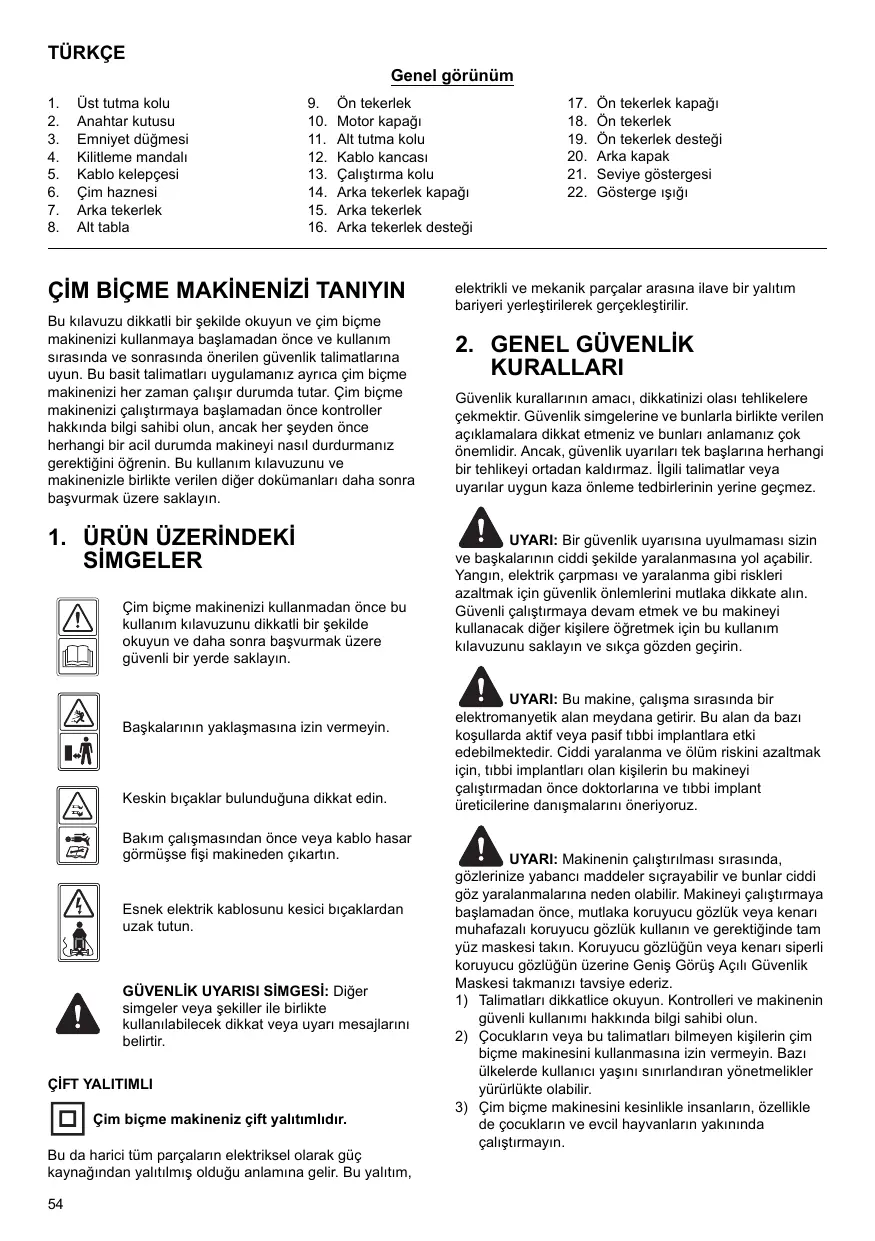 GÜVENLİK UYARISI SİMGESİ: Diğer simgeler veya şekiller ile birlikte kullanılabilecek dikkat veya uyarı mesajlarını belirtir. ÇİFT YALITIMLI Çim biçme makineniz çift yalıtımlıdır. Bu da harici tüm parçaların elektriksel olarak güç kaynağından yalıtılmış olduğu anlamına gelir. Bu yalıtım, 54