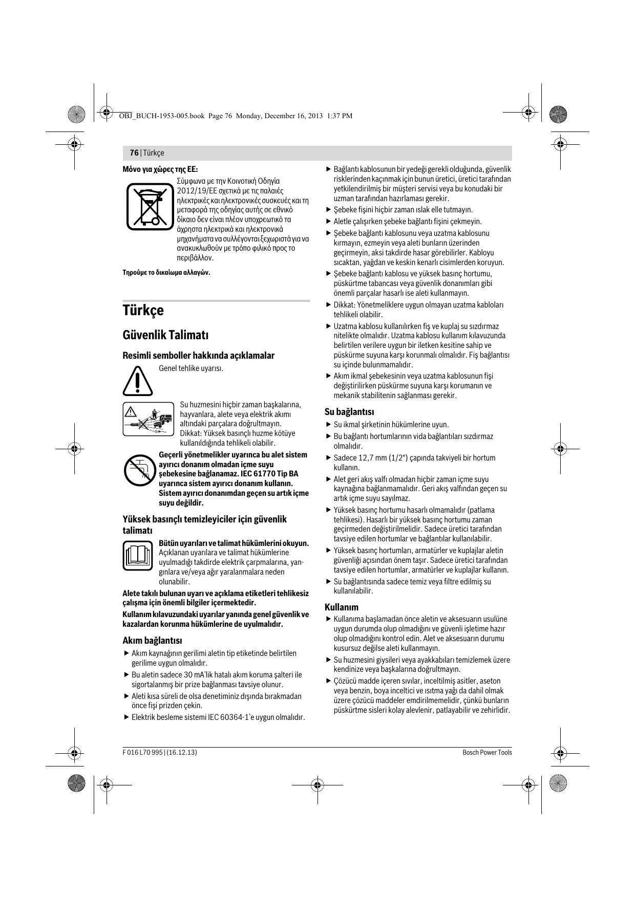 Το πλυντικό υψηλής πίεσης, τα εξαρτήματα και η συσκευασία πρέπει να ανακυκλώνονται με τρόπο φιλικό προς το περιβάλλον. Μην ρίχνετε τα πλυντικά υψηλής πίεσης στα απορρίμματα του σπιτιού σας! F 016 L70 995 | (16.12.13) OBJ_BUCH-1953-005.book Page 76 Monday, December 16, 2013 1:37 PM 76 | Türkçe Μόνο για χώρες της ΕΕ: Σύμφωνα με την Κοινοτική Οδηγία 2012/19/EE σχετικά με τις παλαιές ηλεκτρικές και ηλεκτρονικές συσκευές και τη μεταφορά της οδηγίας αυτής σε εθνικό δίκαιο δεν είναι πλέον υποχρεωτικό τα άχρηστα ηλεκτρικά και ηλεκτρονικά μηχανήματα να συλλέγονται ξεχωριστά για να ανακυκλωθούν με τρόπο φιλικό προς το περιβάλλον. Τηρούμε το δικαίωμα αλλαγών. Türkçe Güvenlik Talimatı Resimli semboller hakkında açıklamalar Genel tehlike uyarısı. Su huzmesini hiçbir zaman başkalarına, hayvanlara, alete veya elektrik akımı altındaki parçalara doğrultmayın. Dikkat: Yüksek basınçlı huzme kötüye kullanıldığında tehlikeli olabilir. Geçerli yönetmelikler uyarınca bu alet sistem ayırıcı donanım olmadan içme suyu şebekesine bağlanamaz. IEC 61770 Tip BA uyarınca sistem ayırıcı donanım kullanın. Sistem ayırıcı donanımdan geçen su artık içme suyu değildir. Yüksek basınçlı temizleyiciler için güvenlik talimatı Bütün uyarıları ve talimat hükümlerini okuyun. Açıklanan uyarılara ve talimat hükümlerine uyulmadığı takdirde elektrik çarpmalarına, yangınlara ve/veya ağır yaralanmalara neden olunabilir. Alete takılı bulunan uyarı ve açıklama etiketleri tehlikesiz çalışma için önemli bilgiler içermektedir. Kullanım kılavuzundaki uyarılar yanında genel güvenlik ve kazalardan korunma hükümlerine de uyulmalıdır. Akım bağlantısı Akım kaynağının gerilimi aletin tip etiketinde belirtilen gerilime uygun olmalıdır. Bu aletin sadece 30 mA’lik hatalı akım koruma şalteri ile sigortalanmış bir prize bağlanması tavsiye olunur. Aleti kısa süreli de olsa denetiminiz dışında bırakmadan önce fişi prizden çekin. Elektrik besleme sistemi IEC 60364-1’e uygun olmalıdır. F 016 L70 995 | (16.12.13) Bağlantı kablosunun bir yedeği gerekli olduğunda, güvenlik risklerinden kaçınmak için bunun üretici, üretici tarafından yetkilendirilmiş bir müşteri servisi veya bu konudaki bir uzman tarafından hazırlaması gerekir. Şebeke fişini hiçbir zaman ıslak elle tutmayın. Aletle çalışırken şebeke bağlantı fişini çekmeyin. Şebeke bağlantı kablosunu veya uzatma kablosunu kırmayın, ezmeyin veya aleti bunların üzerinden geçirmeyin, aksi takdirde hasar görebilirler. Kabloyu sıcaktan, yağdan ve keskin kenarlı cisimlerden koruyun. Şebeke bağlantı kablosu ve yüksek basınç hortumu, püskürtme tabancası veya güvenlik donanımları gibi önemli parçalar hasarlı ise aleti kullanmayın. Dikkat: Yönetmeliklere uygun olmayan uzatma kabloları tehlikeli olabilir. Uzatma kablosu kullanılırken fiş ve kuplaj su sızdırmaz nitelikte olmalıdır. Uzatma kablosu kullanım kılavuzunda belirtilen verilere uygun bir iletken kesitine sahip ve püskürme suyuna karşı korunmalı olmalıdır. Fiş bağlantısı su içinde bulunmamalıdır. Akım ikmal şebekesinin veya uzatma kablosunun fişi değiştirilirken püskürme suyuna karşı korumanın ve mekanik stabilitenin sağlanması gerekir. Su bağlantısı Su ikmal şirketinin hükümlerine uyun. Bu bağlantı hortumlarının vida bağlantıları sızdırmaz olmalıdır. Sadece 12,7 mm (1/2") çapında takviyeli bir hortum kullanın. Alet geri akış valfı olmadan hiçbir zaman içme suyu kaynağına bağlanmamalıdır. Geri akış valfından geçen su artık içme suyu sayılmaz. Yüksek basınç hortumu hasarlı olmamalıdır (patlama tehlikesi). Hasarlı bir yüksek basınç hortumu zaman geçirmeden değiştirilmelidir. Sadece üretici tarafından tavsiye edilen hortumlar ve bağlantılar kullanılabilir. Yüksek basınç hortumları, armatürler ve kuplajlar aletin güvenliği açısından önem taşır. Sadece üretici tarafından tavsiye edilen hortumlar, armatürler ve kuplajlar kullanın. Su bağlantısında sadece temiz veya filtre edilmiş su kullanılabilir. Kullanım Kullanıma başlamadan önce aletin ve aksesuarın usulüne uygun durumda olup olmadığını ve güvenli işletime hazır olup olmadığını kontrol edin. Alet ve aksesuarın durumu kusursuz değilse aleti kullanmayın. Su huzmesini giysileri veya ayakkabıları temizlemek üzere kendinize veya başkalarına doğrultmayın. Çözücü madde içeren sıvılar, inceltilmiş asitler, aseton veya benzin, boya inceltici ve ısıtma yağı da dahil olmak üzere çözücü maddeler emdirilmemelidir, çünkü bunların püskürtme sisleri kolay alevlenir, patlayabilir ve zehirlidir. Bosch Power Tools OBJ_BUCH-1953-005.book Page 77 Monday, December 16, 2013 1:37 PM Türkçe | 77 Alet tehlikeli yerlerde (örneğin benzin istasyonlarının yakınında) kullanılırken ilgili güvenlik önlemlerine uyun. Patlama tehlikesi olan yerlerde bu aletle çalışmak yasaktır. Bu alet sağlam bir zemine yerleştirilmelidir. Sadece üretici tarafından tavsiye edilen temizlik maddeleri kullanın ve üreticinin kullanım, tasfiye ve güvenlik uyarılarına uyun. Çalışma yerindeki bütün akım ileten parçalar püskürme suyuna karşı korunmuş olmalıdır. Tetik ve püskürtme tabancası işletme esnasında “ON” (açık) konumunda sabitlenmemelidir. Püskürme suyuna karşı uygun koruyucu giysi kullanın. Koruyu giysisi bulunmayan ki