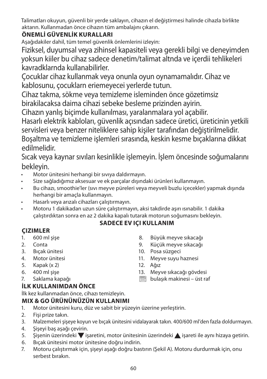 • Utilisez cet appareil exclusivement pour la préparation de smoothies. N’utilisez pas l’appareil s’il est endommagé ou ne fonctionne pas correctement. Ne faites pas fonctionner l’appareil plus d’une minute d’affilée afin d’éviter qu’il ne surchauffe.Après une minute, laissez reposer l’appareil pendant au moins 2 minutes pour que le moteur se refroidisse.