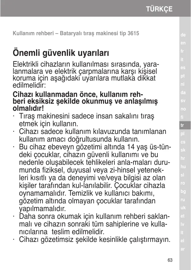 ·· Utilisez exclusivement les accessoires recommandés par le fabricant. ·· Tenez l’appareil et le câble secteur éloignés des surfaces chaudes. ·· N’utilisez et ne rangez pas l’appareil avec un câble secteur vrillé ou pincé. ·· Utilisez et rangez l’appareil uniquement dans des endroits secs. ·· Pour charger l’appareil, utilisez exclusivement le câble secteur fourni. Ne remplacez les câbles secteur défectueux que par des pièces détachées d’origine que vous pourrez obtenir auprès de notre centre de SAV. ·· N’essayez pas de changer des batteries vous-même. ·· Les batteries ne doivent être remplacées que dans un centre de SAV et par des modèles homologués par le fabricant. ·· N’utilisez jamais l’appareil avec une grille de rasoir endommagée. ·· Nous déclinons toute responsabilité pour les dommages consécutifs à une utilisation inappropriée ou au non-respect de ce mode d’emploi. 17