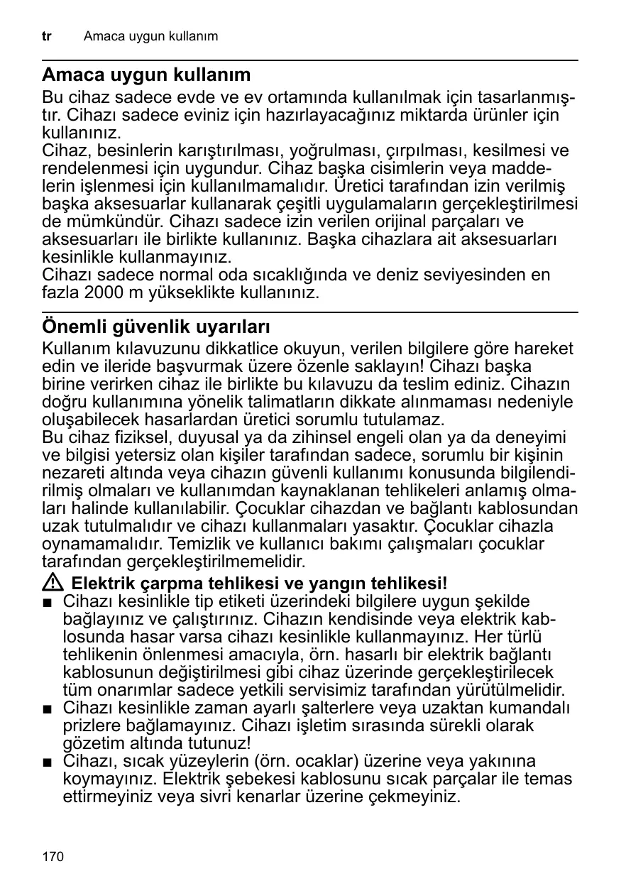 Amaca uygun kullanım Amaca uygun kullanım Bu cihaz sadece evde ve ev ortamında kullanılmak için tasarlanmıştır. Cihazı sadece eviniz için hazırlayacağınız miktarda ürünler için kullanınız. Cihaz, besinlerin karıştırılması, yoğrulması, çırpılması, kesilmesi ve rendelenmesi için uygundur. Cihaz başka cisimlerin veya maddelerin işlenmesi için kullanılmamalıdır. Üretici tarafından izin verilmiş başka aksesuarlar kullanarak çeşitli uygulamaların gerçekleştirilmesi de mümkündür. Cihazı sadece izin verilen orijinal parçaları ve aksesuarları ile birlikte kullanınız. Başka cihazlara ait aksesuarları kesinlikle kullanmayınız. Cihazı sadece normal oda sıcaklığında ve deniz seviyesinden en fazla 2000 m yükseklikte kullanınız. Önemli güvenlik uyarıları Kullanım kılavuzunu dikkatlice okuyun, verilen bilgilere göre hareket edin ve ileride başvurmak üzere özenle saklayın! Cihazı başka birine verirken cihaz ile birlikte bu kılavuzu da teslim ediniz. Cihazın doğru kullanımına yönelik talimatların dikkate alınmaması nedeniyle oluşabilecek hasarlardan üretici sorumlu tutulamaz. Bu cihaz fiziksel, duyusal ya da zihinsel engeli olan ya da deneyimi ve bilgisi yetersiz olan kişiler tarafından sadece, sorumlu bir kişinin nezareti altında veya cihazın güvenli kullanımı konusunda bilgilendirilmiş olmaları ve kullanımdan kaynaklanan tehlikeleri anlamış olmaları halinde kullanılabilir. Çocuklar cihazdan ve bağlantı kablosundan uzak tutulmalıdır ve cihazı kullanmaları yasaktır. Çocuklar cihazla oynamamalıdır. Temizlik ve kullanıcı bakımı çalışmaları çocuklar tarafından gerçekleştirilmemelidir. W Elektrik çarpma tehlikesi ve yangın tehlikesi! ■ Cihazı kesinlikle tip etiketi üzerindeki bilgilere uygun şekilde bağlayınız ve çalıştırınız. Cihazın kendisinde veya elektrik kablosunda hasar varsa cihazı kesinlikle kullanmayınız. Her türlü tehlikenin önlenmesi amacıyla, örn. hasarlı bir elektrik bağlantı kablosunun değiştirilmesi gibi cihaz üzerinde gerçekleştirilecek tüm onarımlar sadece yetkili servisimiz tarafından yürütülmelidir. ■ Cihazı kesinlikle zaman ayarlı şalterlere veya uzaktan kumandalı prizlere bağlamayınız. Cihazı işletim sırasında sürekli olarak gözetim altında tutunuz! ■ Cihazı, sıcak yüzeylerin (örn. ocaklar) üzerine veya yakınına koymayınız. Elektrik şebekesi kablosunu sıcak parçalar ile temas ettirmeyiniz veya sivri kenarlar üzerine çekmeyiniz.