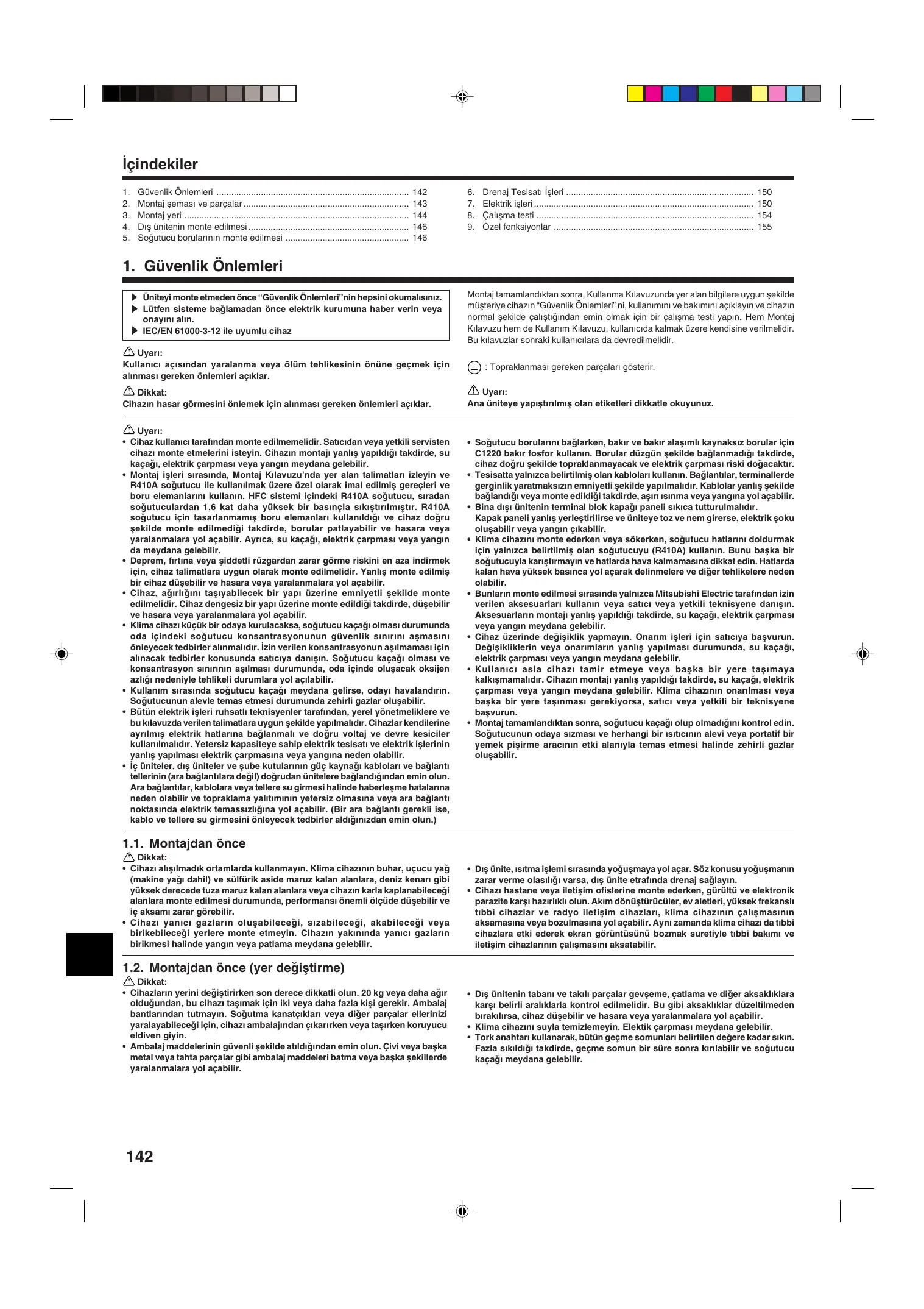 1. Güvenlik Önlemleri s Üniteyi monte etmeden önce “Güvenlik Önlemleri”nin hepsini okumal›s›n›z. s Lütfen sisteme ba¤lamadan önce elektrik kurumuna haber verin veya onay›n› al›n. s IEC/EN 61000-3-12 ile uyumlu cihaz Uyar›: Kullan›c› aç›s›ndan yaralanma veya ölüm tehlikesinin önüne geçmek için al›nmas› gereken önlemleri aç›klar. Dikkat: Cihaz›n hasar görmesini önlemek için al›nmas› gereken önlemleri aç›klar. Uyar›: • Cihaz kullan›c› taraf›ndan monte edilmemelidir. Sat›c›dan veya yetkili servisten cihaz› monte etmelerini isteyin. Cihaz›n montaj› yanl›fl yap›ld›¤› takdirde, su kaça¤›, elektrik çarpmas› veya yang›n meydana gelebilir. • Montaj iflleri s›ras›nda, Montaj K›lavuzu’nda yer alan talimatlar› izleyin ve R410A so¤utucu ile kullan›lmak üzere özel olarak imal edilmifl gereçleri ve boru elemanlar›n› kullan›n. HFC sistemi içindeki R410A so¤utucu, s›radan so¤utuculardan 1,6 kat daha yüksek bir bas›nçla s›k›flt›r›lm›flt›r. R410A so¤utucu için tasarlanmam›fl boru elemanlar› kullan›ld›¤› ve cihaz do¤ru flekilde monte edilmedi¤i takdirde, borular patlayabilir ve hasara veya yaralanmalara yol açabilir. Ayr›ca, su kaça¤›, elektrik çarpmas› veya yang›n da meydana gelebilir. • Deprem, f›rt›na veya fliddetli rüzgardan zarar görme riskini en aza indirmek için, cihaz talimatlara uygun olarak monte edilmelidir. Yanl›fl monte edilmifl bir cihaz düflebilir ve hasara veya yaralanmalara yol açabilir. • Cihaz, a¤›rl›¤›n› tafl›yabilecek bir yap› üzerine emniyetli flekilde monte edilmelidir. Cihaz dengesiz bir yap› üzerine monte edildi¤i takdirde, düflebilir ve hasara veya yaralanmalara yol açabilir. • Klima cihaz› küçük bir odaya kurulacaksa, so¤utucu kaça¤› olmas› durumunda oda içindeki so¤utucu konsantrasyonunun güvenlik s›n›r›n› aflmas›n› önleyecek tedbirler al›nmal›d›r. ‹zin verilen konsantrasyonun afl›lmamas› için al›nacak tedbirler konusunda sat›c›ya dan›fl›n. So¤utucu kaça¤› olmas› ve konsantrasyon s›n›r›n›n afl›lmas› durumunda, oda içinde oluflacak oksijen azl›¤› nedeniyle tehlikeli durumlara yol aç›labilir. • Kullan›m s›ras›nda so¤utucu kaça¤› meydana gelirse, oday› havaland›r›n. So¤utucunun alevle temas etmesi durumunda zehirli gazlar oluflabilir. • Bütün elektrik iflleri ruhsatl› teknisyenler taraf›ndan, yerel yönetmeliklere ve bu k›lavuzda verilen talimatlara uygun flekilde yap›lmal›d›r. Cihazlar kendilerine ayr›lm›fl elektrik hatlar›na ba¤lanmal› ve do¤ru voltaj ve devre kesiciler kullan›lmal›d›r. Yetersiz kapasiteye sahip elektrik tesisat› ve elektrik ifllerinin yanl›fl yap›lmas› elektrik çarpmas›na veya yang›na neden olabilir. • ‹ç üniteler, dıfl üniteler ve flube kutularının güç kayna¤ı kabloları ve ba¤lantı tellerinin (ara ba¤lantılara de¤il) do¤rudan ünitelere ba¤landı¤ından emin olun. Ara ba¤lantılar, kablolara veya tellere su girmesi halinde haberleflme hatalarına neden olabilir ve topraklama yalıtımının yetersiz olmasına veya ara ba¤lantı noktasında elektrik temassızlı¤ına yol açabilir. (Bir ara ba¤lantı gerekli ise, kablo ve tellere su girmesini önleyecek tedbirler aldı¤ınızdan emin olun.)