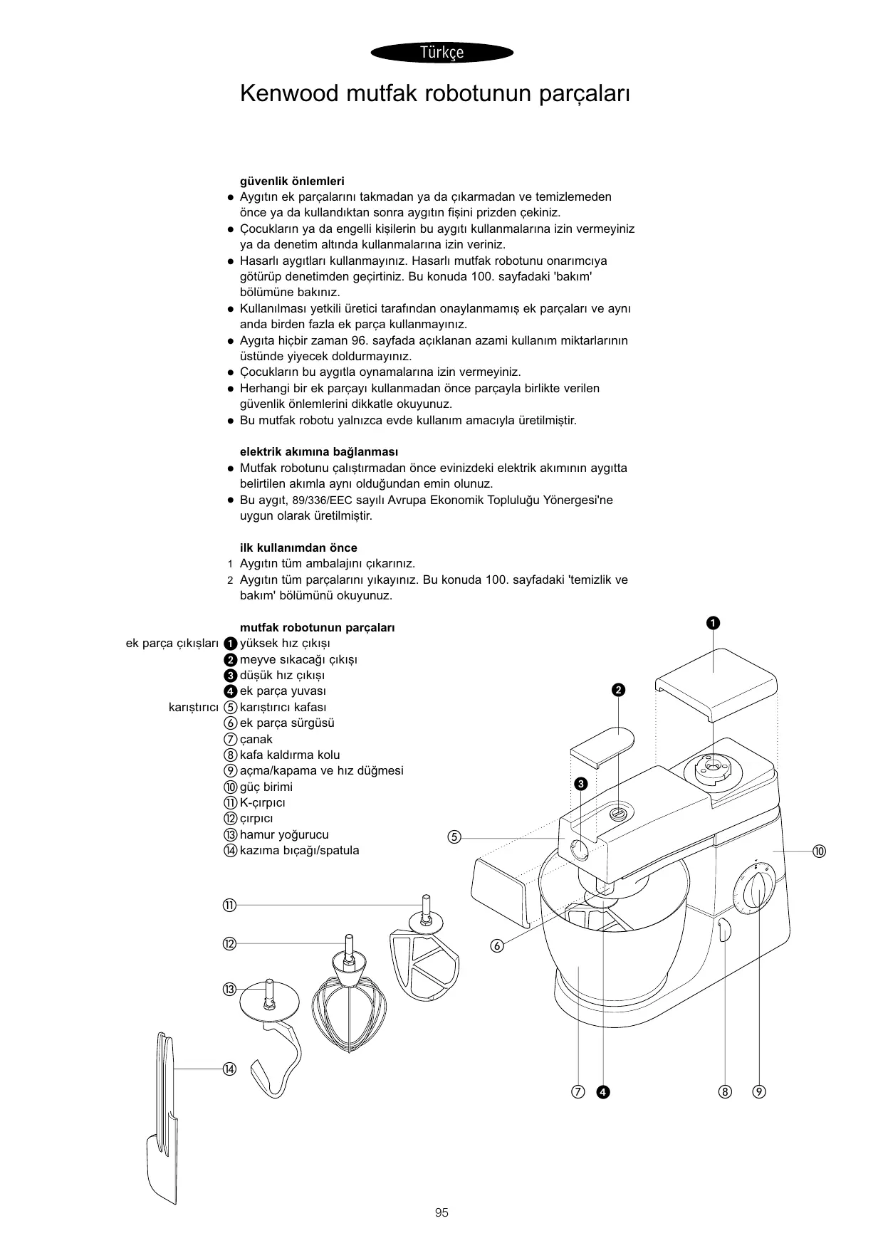 güvenlik önlemleri Aygıtın ek parçalarını takmadan ya da çıkarmadan ve temizlemeden önce ya da kullandıktan sonra aygıtın fi…ini prizden çekiniz. Çocukların ya da engelli ki…ilerin bu aygıtı kullanmalarına izin vermeyiniz ya da denetim altında kullanmalarına izin veriniz. Hasarlı aygıtları kullanmayınız. Hasarlı mutfak robotunu onarımcıya götürüp denetimden geçirtiniz. Bu konuda 100. sayfadaki 'bakım' bölümüne bakınız. Kullanılması yetkili üretici tarafından onaylanmamı… ek parçaları ve aynı anda birden fazla ek parça kullanmayınız. Aygıta hiçbir zaman 96. sayfada açıklanan azami kullanım miktarlarının üstünde yiyecek doldurmayınız. Çocukların bu aygıtla oynamalarına izin vermeyiniz. Herhangi bir ek parçayı kullanmadan önce parçayla birlikte verilen güvenlik önlemlerini dikkatle okuyunuz. Bu mutfak robotu yalnızca evde kullanım amacıyla üretilmi…tir. elektrik akımına baòlanması Mutfak robotunu çalı…tırmadan önce evinizdeki elektrik akımının aygıtta belirtilen akımla aynı olduòundan emin olunuz. Bu aygıt, 89/336/EEC sayılı Avrupa Ekonomik Topluluòu Yönergesi'ne uygun olarak üretilmi…tir. ilk kullanımdan önce 1 Aygıtın tüm ambalajını çıkarınız. 2 Aygıtın tüm parçalarını yıkayınız. Bu konuda 100. sayfadaki 'temizlik ve bakım' bölümünü okuyunuz. mutfak robotunun parçaları ek parça çıkı…ları yüksek hız çıkı…ı meyve sıkacaòı çıkı…ı dü…ük hız çıkı…ı ek parça yuvası karı…tırıcı karı…tırıcı kafası ek parça sürgüsü çanak kafa kaldırma kolu açma/kapama ve hız düòmesi güç birimi K-çırpıcı çırpıcı hamur yoòurucu kazıma bıçaòı/spatula