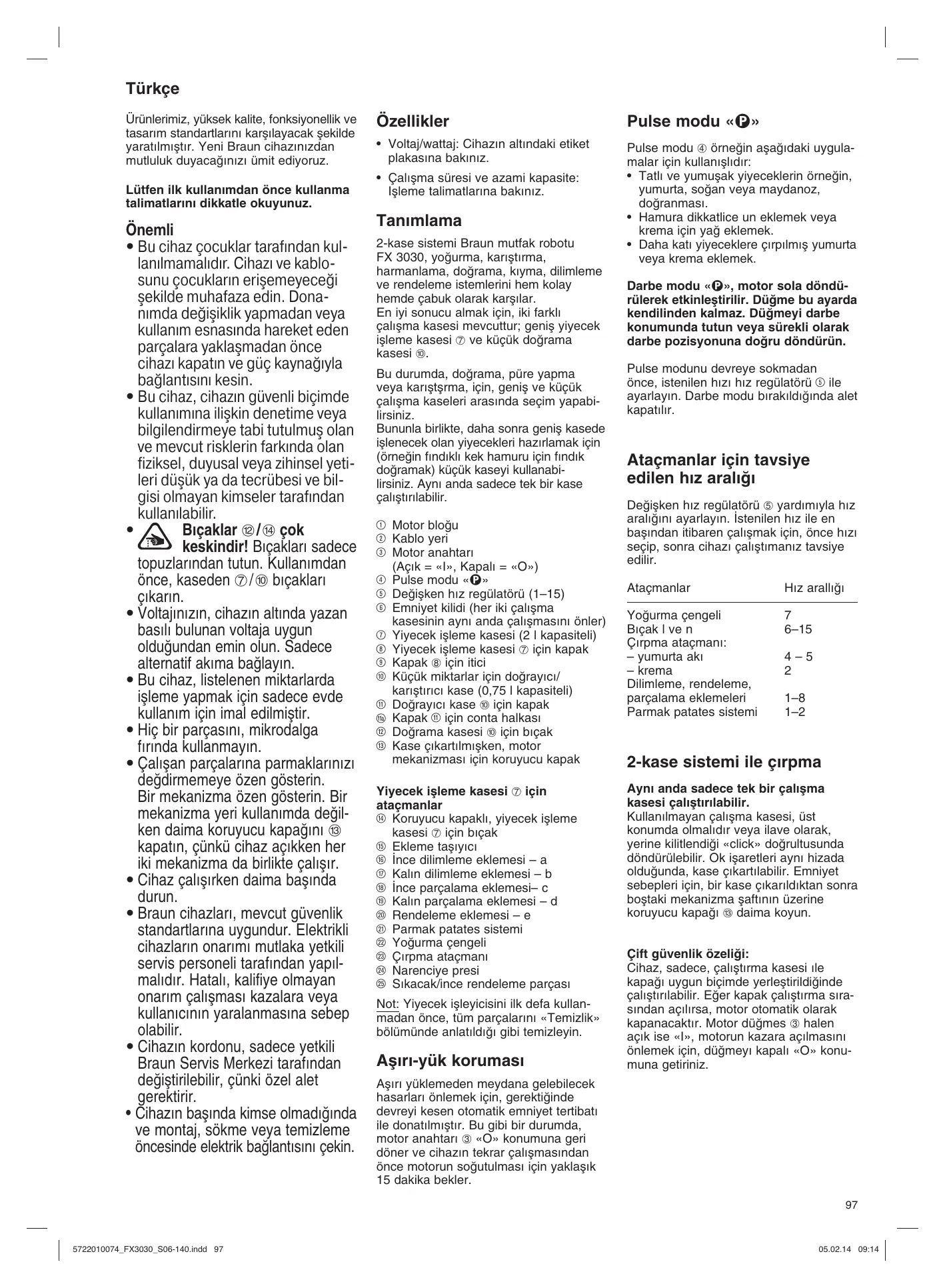 - Çalıμma süresi ve azami kapasite: Iμleme talimatlarına bakınız. Tanımlama 2-kase sistemi Braun mutfak robotu FX 3030, yoπurma, karıμtırma, harmanlama, doπrama, kıyma, dilimleme ve rendeleme istemlerini hem kolay hemde çabuk olarak karμılar. En iyi sonucu almak için, iki farklı çalıμma kasesi mevcuttur; geniμ yiyecek iμleme kasesi 7 ve küçük doπrama kasesi j. Bu durumda, doπrama, püre yapma veya karıμtμrma, için, geniμ ve küçük çalıμma kaseleri arasında seçim yapabilirsiniz. Bununla birlikte, daha sonra geniμ kasede iμlenecek olan yiyecekleri hazırlamak için (örneπin fındıklı kek hamuru için fındık doπramak) küçük kaseyi kullanabilirsiniz. Aynı anda sadece tek bir kase çalıμtırılabilir. 1 Motor bloπu 2 Kablo yeri 3 Motor anahtarı (Açık = «I», Kapalı = «O») 4 Pulse modu «» 5 Deπiμken hız regülatörü (1–15) 6 Emniyet kilidi (her iki çalıμma kasesinin aynı anda çalıμmasını önler) 7 Yiyecek iμleme kasesi (2 l kapasiteli) 8 Yiyecek iμleme kasesi 7 için kapak 9 Kapak 8 için itici 0 Küçük miktarlar için doπrayıcı/ karıμtırıcı kase (0,75 l kapasiteli) q Doπrayıcı kase j için kapak 11a Kapak q için conta halkası w Doπrama kasesi j için bıçak e Kase çıkartılmıμken, motor mekanizması için koruyucu kapak Yiyecek iμleme kasesi 7 için ataçmanlar r Koruyucu kapaklı, yiyecek iμleme kasesi 7 için bıçak t Ekleme taμıyıcı z ∑nce dilimleme eklemesi – a u Kalın dilimleme eklemesi – b i ∑nce parçalama eklemesi– c o Kalın parçalama eklemesi – d p Rendeleme eklemesi – e a Parmak patates sistemi s Yoπurma çengeli d Çırpma ataçmanı f Narenciye presi g Sıkacak/ince rendeleme parçası Not: Yiyecek iμleyicisini ilk defa kullanmadan önce, tüm parçalarını «Temizlik» bölümünde anlatıldıπı gibi temizleyin. Aμırı-yük koruması Darbe modu «», motor sola döndürülerek etkinleştirilir. Düğme bu ayarda kendilinden kalmaz. Düğmeyi darbe konumunda tutun veya sürekli olarak darbe pozisyonuna doğru döndürün. Pulse modunu devreye sokmadan önce, istenilen hızı hız regülatörü 5 ile ayarlayın. Darbe modu bırakıldığında alet kapatılır. Ataçmanlar için tavsiye edilen hız aralıπı Deπiμken hız regülatörü 5 yardımıyla hız aralıπını ayarlayın. ∑stenilen hız ile en baμından itibaren çalıμmak için, önce hızı seçip, sonra cihazı çalıμtımanız tavsiye edilir. Ataçmanlar Hız arallıπı Yoπurma çengeli Bıçak l ve n Çırpma ataçmanı: – yumurta akı – krema Dilimleme, rendeleme, parçalama eklemeleri Parmak patates sistemi
