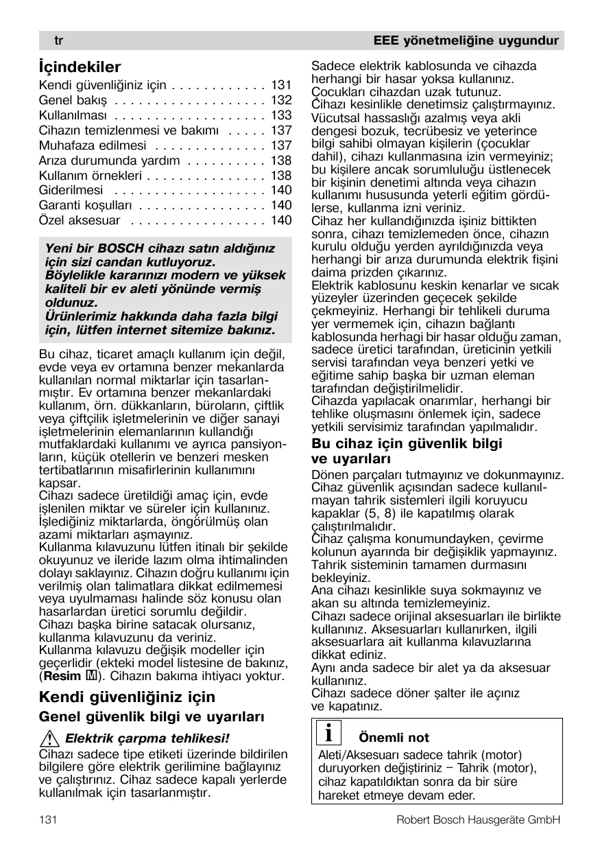 Yeni bir BOSCH cihazý satýn aldýðýnýz için sizi candan kutluyoruz. Böylelikle kararýnýzý modern ve yüksek kaliteli bir ev aleti yönünde vermiþ oldunuz. Ürünlerimiz hakkýnda daha fazla bilgi için, lütfen internet sitemize bakýnýz. Bu cihaz, ticaret amaçlý kullaným için deðil, evde veya ev ortamýna benzer mekanlarda kullanýlan normal miktarlar için tasarlanmýþtýr. Ev ortamýna benzer mekanlardaki kullaným, örn. dükkanlarýn, bürolarýn, çiftlik veya çiftçilik iþletmelerinin ve diðer sanayi iþletmelerinin elemanlarýnýn kullandýðý mutfaklardaki kullanýmý ve ayrýca pansiyonlarýn, küçük otellerin ve benzeri mesken tertibatlarýnýn misafirlerinin kullanýmýný kapsar. Cihazý sadece üretildiði amaç için, evde iþlenilen miktar ve süreler için kullanýnýz. Ýþlediðiniz miktarlarda, öngörülmüþ olan azami miktarlarý aþmayýnýz. Kullanma kýlavuzunu lütfen itinalý bir þekilde okuyunuz ve ileride lazým olma ihtimalinden dolayý saklayýnýz. Cihazýn doðru kullanýmý için verilmiþ olan talimatlara dikkat edilmemesi veya uyulmamasý halinde söz konusu olan hasarlardan üretici sorumlu deðildir. Cihazý baþka birine satacak olursanýz, kullanma kýlavuzunu da veriniz. Kullanma kýlavuzu deðiþik modeller için geçerlidir (ekteki model listesine de bakýnýz, (Resim ). Cihazýn bakýma ihtiyacý yoktur. Kendi güvenliðiniz için Genel güvenlik bilgi ve uyarýlarý Elektrik çarpma tehlikesi! Cihazý sadece tipe etiketi üzerinde bildirilen bilgilere göre elektrik gerilimine baðlayýnýz ve çalýþtýrýnýz. Cihaz sadece kapalý yerlerde kullanýlmak için tasarlanmýþtýr. NPN Sadece elektrik kablosunda ve cihazda herhangi bir hasar yoksa kullanýnýz. Çocuklarý cihazdan uzak tutunuz. Cihazý kesinlikle denetimsiz çalýþtýrmayýnýz. Vücutsal hassaslýðý azalmýþ veya akli dengesi bozuk, tecrübesiz ve yeterince bilgi sahibi olmayan kiþilerin (çocuklar dahil), cihazý kullanmasýna izin vermeyiniz; bu kiþilere ancak sorumluluðu üstlenecek bir kiþinin denetimi altýnda veya cihazýn kullanýmý hususunda yeterli eðitim gördülerse, kullanma izni veriniz. Cihaz her kullandýðýnýzda iþiniz bittikten sonra, cihazý temizlemeden önce, cihazýn kurulu olduðu yerden ayrýldýðýnýzda veya herhangi bir arýza durumunda elektrik fiþini daima prizden çýkarýnýz. Elektrik kablosunu keskin kenarlar ve sýcak yüzeyler üzerinden geçecek þekilde çekmeyiniz. Herhangi bir tehlikeli duruma yer vermemek için, cihazýn baðlantý kablosunda herhagi bir hasar olduðu zaman, sadece üretici tarafýndan, üreticinin yetkili servisi tarafýndan veya benzeri yetki ve eðitime sahip baþka bir uzman eleman tarafýndan deðiþtirilmelidir. Cihazda yapýlacak onarýmlar, herhangi bir tehlike oluþmasýný önlemek için, sadece yetkili servisimiz tarafýndan yapýlmalýdýr. Bu cihaz için güvenlik bilgi ve uyarýlarý Dönen parçalarý tutmayýnýz ve dokunmayýnýz. Cihaz güvenlik açýsýndan sadece kullanýlmayan tahrik sistemleri ilgili koruyucu kapaklar (5, 8) ile kapatýlmýþ olarak çalýþtýrýlmalýdýr. Cihaz çalýþma konumundayken, çevirme kolunun ayarýnda bir deðiþiklik yapmayýnýz. Tahrik sisteminin tamamen durmasýný bekleyiniz. Ana cihazý kesinlikle suya sokmayýnýz ve akan su altýnda temizlemeyiniz. Cihazý sadece orijinal aksesuarlarý ile birlikte kullanýnýz. Aksesuarlarý kullanýrken, ilgili aksesuarlara ait kullanma kýlavuzlarýna dikkat ediniz. Ayný anda sadece bir alet ya da aksesuar kullanýnýz. Cihazý sadece döner þalter ile açýnýz ve kapatýnýz. Önemli not Aleti/Aksesuarý sadece tahrik (motor) duruyorken deðiþtiriniz — Tahrik (motor), cihaz kapatýldýktan sonra da bir süre hareket etmeye devam eder. oçÄÉêí=_çëÅÜ=e~ìëÖÉê®íÉ=dãÄe