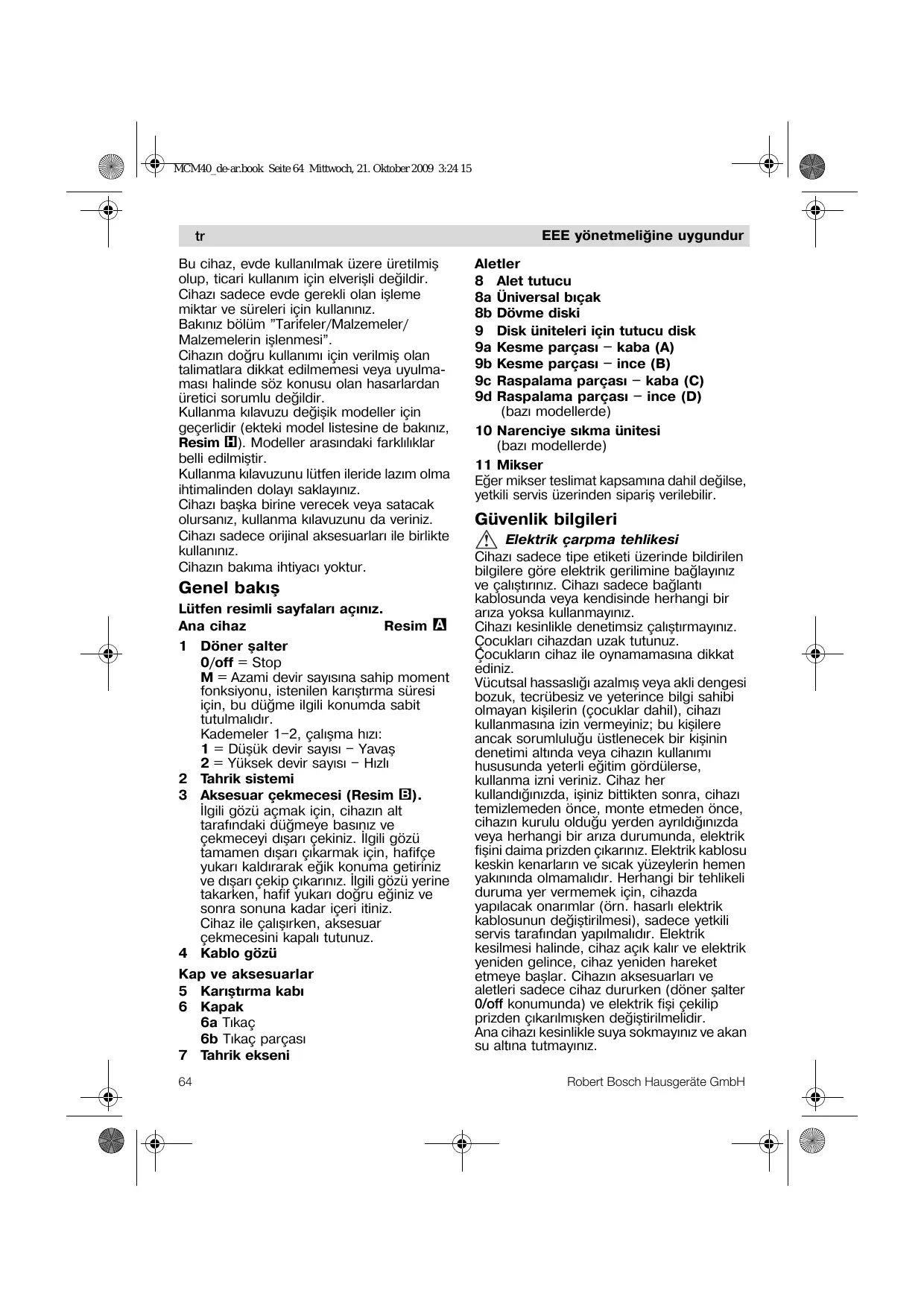 EEE yönetmeliðine uygundur Aletler 8 Alet tutucu 8a Üniversal býçak 8b Dövme diski 9 Disk üniteleri için tutucu disk 9a Kesme parçasý — kaba (A) 9b Kesme parçasý — ince (B) 9c Raspalama parçasý — kaba (C) 9d Raspalama parçasý — ince (D) (bazý modellerde) 10 Narenciye sýkma ünitesi= (bazý modellerde) 11 Mikser Eðer mikser teslimat kapsamýna dahil deðilse, yetkili servis üzerinden sipariþ verilebilir. Güvenlik bilgileri Elektrik çarpma tehlikesi Cihazý sadece tipe etiketi üzerinde bildirilen bilgilere göre elektrik gerilimine baðlayýnýz ve çalýþtýrýnýz. Cihazý sadece baðlantý kablosunda veya kendisinde herhangi bir arýza yoksa kullanmayýnýz. Cihazý kesinlikle denetimsiz çalýþtýrmayýnýz. Çocuklarý cihazdan uzak tutunuz. Çocuklarýn cihaz ile oynamamasýna dikkat ediniz. Vücutsal hassaslýðý azalmýþ veya akli dengesi bozuk, tecrübesiz ve yeterince bilgi sahibi olmayan kiþilerin (çocuklar dahil), cihazý kullanmasýna izin vermeyiniz; bu kiþilere ancak sorumluluðu üstlenecek bir kiþinin denetimi altýnda veya cihazýn kullanýmý hususunda yeterli eðitim gördülerse, kullanma izni veriniz. Cihaz her kullandýðýnýzda, iþiniz bittikten sonra, cihazý temizlemeden önce, monte etmeden önce, cihazýn kurulu olduðu yerden ayrýldýðýnýzda veya herhangi bir arýza durumunda, elektrik fiþini daima prizden çýkarýnýz. Elektrik kablosu keskin kenarlarýn ve sýcak yüzeylerin hemen yakýnýnda olmamalýdýr. Herhangi bir tehlikeli duruma yer vermemek için, cihazda yapýlacak onarýmlar (örn. hasarlý elektrik kablosunun deðiþtirilmesi), sadece yetkili servis tarafýndan yapýlmalýdýr. Elektrik kesilmesi halinde, cihaz açýk kalýr ve elektrik yeniden gelince, cihaz yeniden hareket etmeye baþlar. Cihazýn aksesuarlarý ve aletleri sadece cihaz dururken (döner þalter MLçÑÑ konumunda) ve elektrik fiþi çekilip prizden çýkarýlmýþken deðiþtirilmelidir. Ana cihazý kesinlikle suya sokmayýnýz ve akan su altýna tutmayýnýz. oçÄÉêí=_çëÅÜ=e~ìëÖÉê®íÉ=dãÄe MCM40_de-ar.book Seite 65 Mittwoch, 21. Oktober 2009 3:24 15