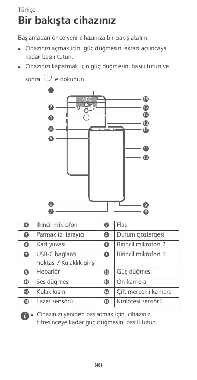 İkincil mikrofon Flaş Parmak izi tarayıcı Durum göstergesi Kart yuvası Birincil mikrofon 2 USB-C bağlantı noktası / Kulaklık girişi Hoparlör Birincil mikrofon 1 Ses düğmesi Ön kamera Kulak kısmı Çift mercekli kamera Lazer sensörü Kızılötesi sensörü Güç düğmesi Cihazınızı yeniden başlatmak için, cihazınız titreşinceye kadar güç düğmesini basılı tutun.