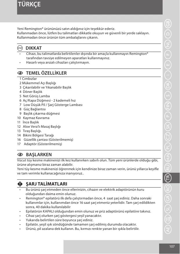 Yeni Remington® ürününüzü satın aldığınız için teşekkür ederiz. Kullanmadan önce, lütfen bu talimatları dikkatle okuyun ve güvenli bir yerde saklayın. Kullanmadan önce ürünün tüm ambalajlarını çıkarın. A DIKKAT