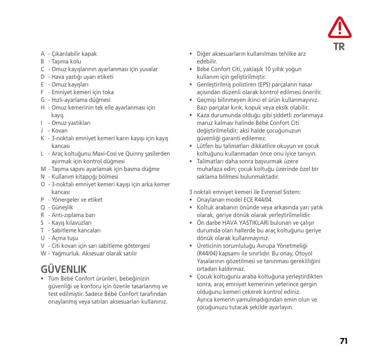 • Diğer aksesuarların kullanılması tehlike arz edebilir. • Bébé Confort Citi, yaklaşık 10 yıllık yoğun kullanım için geliştirilmiştir. • Genleştirilmiş polistiren (EPS) parçaların hasar açısından düzenli olarak kontrol edilmesi önerilir. • Geçmişi bilinmeyen ikinci el ürün kullanmayınız. Bazı parçalar kırık, kopuk veya eksik olabilir. • Kaza durumunda olduğu gibi şiddetli zorlanmaya maruz kalması halinde Bébé Confort Citi değiştirilmelidir; aksi halde çocuğunuzun güvenliği garanti edilemez. • Lütfen bu talimatları dikkatlice okuyun ve çocuk koltuğunu kullanmadan önce onu iyice tanıyın. • Talimatları daha sonra başvurmak üzere muhafaza edin; çocuk koltuğu üzerinde özel bir saklama bölmesi bulunmaktadır.