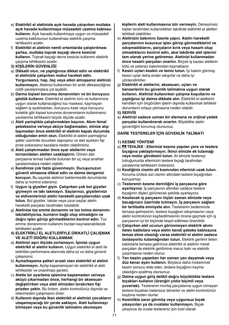 (HSS) • Ne jamais utilisez de disques de meulage/tronçonnage avec cet outil AVANT L’USAGE • Contrôlez toujours si la tension secteur correspond à la tension indiquée sur la plaquette signalétique de l’outil (les outils conçus pour une tension de 230V ou 240V peuvent également être branchés sur 220V) • Faites attention aux vis, clous ou autres éléments qui pourraient se trouver dans la pièce à travailler et qui risqueraient d’endommager très fortement votre outil; enlevez-les avant de commencer le travail • Enlevez tout corps étranger du tracé avant d’effectuer toute coupe • Fixez solidement la pièce à travailler (une pièce fixée à l’aide de dispositifs de fixation est davantage assurée que si elle était tenue à la main) • Utilisez des détecteurs appropriés afin de localiser la présence de conduites électriques ou bien s’adresser à la société locale de distribution (un contact avec des lignes électriques peut provoquer un incendie et une décharge électrique; le fait d’endommager une conduite de gaz peut entraîner une explosion; le fait d’endommager une conduite d’eau peut entraîner des dégâts matériels ou causer une décharge électrique) • Utilisez un câble de prolongement complètement déroulé et de bonne qualité d’une capacité de 16 A PENDANT L’USAGE • Le niveau sonore en fonctionnement peut dépasser 85 dB(A); munissez-vous de casques anti-bruit • Ne jamais utilisez votre outil sans le guide de sécurité d’origine • Ne jamais tentez de couper de trop fines pièces • Ne jamais travaillez au-dessus de l’outil • En cas de blocage ou d’anomalie électrique ou mécanique, coupez immédiatement l’outil et débranchez la prise • Si le câble est endommagé ou rompu pendant le travail, n’y touchez pas, mais débranchez immédiatement la prise APRES L’USAGE • Lorsque vous rangez votre outil, le moteur doit être coupé et les pièces mobiles complètement arrêtées • Après avoir coupé la mise en marche de votre scie circulaire, ne jamais arrêtez la rotation de la lame de scie par une force laterale appliquée contre elle