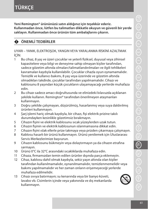 UYARI – YANIK, ELEKTROŞOK, YANGIN VEYA YARALANMA RİSKİNİ AZALTMAK İÇİN: Bu cihaz, 8 yaş ve üzeri çocuklar ve yeterli fiziksel, duyusal veya zihinsel kapasitelere veya bilgi ve deneyime sahip olmayan kişiler tarafından, sadece gözetim altında olmaları/talimatlandırılmaları ve ilgili tehlikeleri kavramaları kaydıyla kullanılabilir. Çocuklar cihazla oyun oynamamalıdır. Temizlik ve kullanıcı bakımı, 8 yaş veya üzerinde ve gözetim altında olmadıkları takdirde, çocuklar tarafından yapılmamalıdır. Cihazı ve kablosunu 8 yaşından küçük çocukların ulaşamayacağı yerlerde muhafaza edin. Bu cihazı sadece amacı doğrultusunda ve elinizdeki kılavuzda açıklanan şekilde kullanın. Remington® tarafından önerilmeyen ataşmanları kullanmayın. Doğru şekilde çalışmayan, düşürülmüş, hasarlanmış veya suya daldırılmış ürünleri kullanmayın. Şarj işlemi hariç olmak kaydıyla, bir cihazı, fişi elektrik prizine takılı durumdayken kesinlikle gözetimsiz bırakmayın. Cihazın fişini ve elektrik kablosunu sıcak yüzeylerden uzak tutun. Cihazın fişinin ve elektrik kablosunun ıslanmamasına dikkat edin. Cihazın fişini ıslak ellerle prize takmaya veya prizden çıkarmaya çalışmayın. Kablosu hasarlı bir ürünü kullanmayın. Ürünü yenilemek için Uluslararası Servis Merkezlerimize başvurun. Cihazın kablosunu bükmeyin veya dolaştırmayın ya da cihazın etrafına sarmayın. 10 Ürünü 0°C ila 32°C arasındaki sıcaklıklarda muhafaza edin. 11 Cihaza, firmamızdan temin edilen ürünler dışında parça eklemeyin. 12 Cihaz, kablosu dahil olmak kaydıyla, sekiz yaşın altında olan kişiler tarafından kullanılmamalıdır, oynanılmamalıdır, temizlenmemelidir veya bakımı yapılmamalıdır ve her zaman onların erişemeyeceği yerlerde muhafaza edilmelidir. 13 Cihazı sıvıya batırmayın; su kenarında veya bir banyo küveti, lavabo vb. Cisimlerin içinde veya yakınında ve dış mekanlarda kullanmayın.