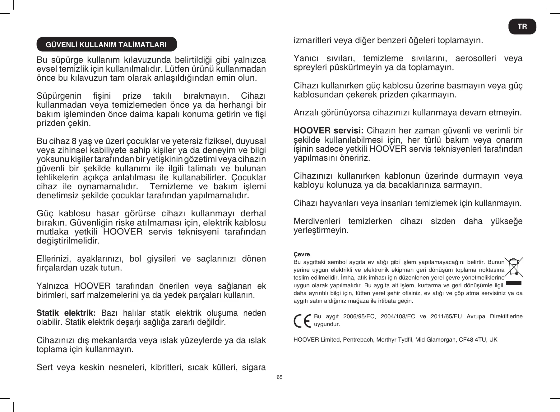 HOOVER Limited, Pentrebach, Merthyr Tydfil, Mid Glamorgan, CF48 4TU, UK Sert veya keskin nesneleri, kibritleri, sıcak külleri, sigara 65