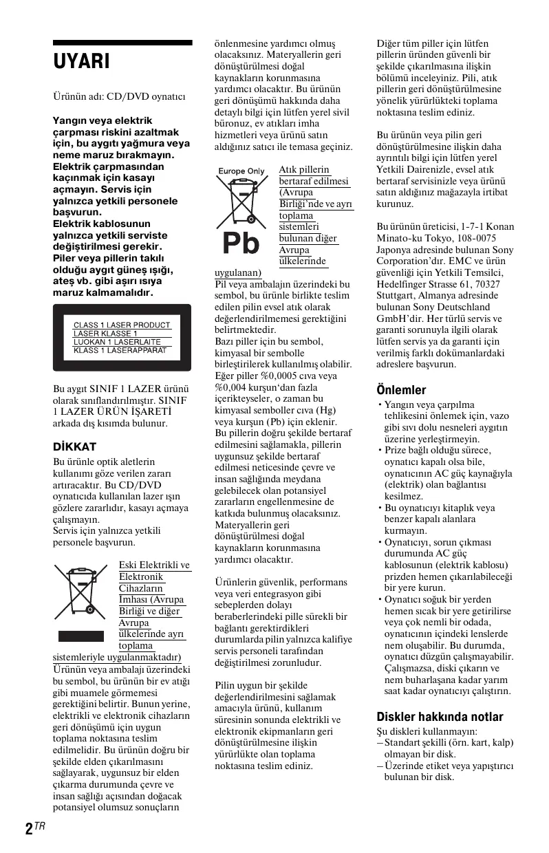 15GR UYARI Ürünün adı: CD/DVD oynatıcı Yangın veya elektrik çarpması riskini azaltmak için, bu aygıtı yağmura veya neme maruz bırakmayın. Elektrik çarpmasından kaçınmak için kasayı açmayın. Servis için yalnızca yetkili personele başvurun. Elektrik kablosunun yalnızca yetkili serviste değiştirilmesi gerekir. Piler veya pillerin takılı olduğu aygıt güneş ışığı, ateş vb. gibi aşırı ısıya maruz kalmamalıdır.
