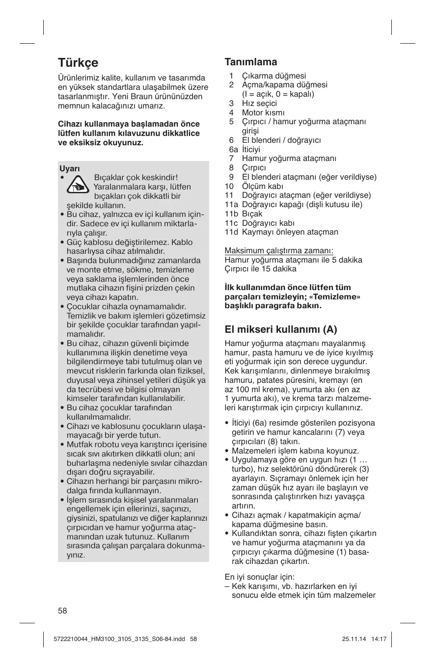 éventuels encourus. • Cet appareil ne doit pas être utilisé par. • Tenir l’appareil et son cordon d’alimentation hors de portée des enfants. • Soyez prudent si vous versez un liquide chaud dans le robot ménager ou le blender car il peut être éjecté de l’appareil à la suite d’une formation soudaine de vapeur. • N’utilisez aucun des éléments de ce produit au micro-ondes. • Tenir mains, cheveux, vêtements, spatules et autres ustensiles loin des fouets et crochets durant l’utilisation pour éviter tout dommage physique. Ne pas toucher les éléments pendant leur fonctionnement. Description 1 2 (100 ml de crème minimum), pour monter les oeufs en neige (un blanc d’oeuf minimum) et autres préparations crémeuses. • Placez le poussoir (6a) comme indiqué sur l’illustration et insérez les crochets pétrisseurs (7) ou les fouets (8). • Mettre les ingrédients dans le bol. • Sélectionnez la vitesse selon l’application (1 … turbo) en faisant tourner le sélecteur de vitesse (3). Pour éviter les éclaboussures, toujours commencer par une vitesse lente et ensuite augmenter la vitesse petit à petit pendant le fonctionnement. • Appuyer sur le bouton marche/arrêt (2) pour allumer ou éteindre l’appareil. • Après utilisation, débrancher l’appareil et éjecter les crochets ou les fouets en appuyant sur le bouton eject (1). Pour des résultats parfaits : – Pour obtenir de meilleurs résultats dans la préparation de pâtes à gâteaux, etc. Tous les ingrédients doivent être à la même température. Enlever le beurre, les oeufs, etc du réfrigérateur peu de temps avant de les utiliser. – La crème fouettée sera plus volumineuse si la crème est bien froide avant d’être fouettée. – La purée de pomme de terre sera beaucoup plus crémeuse, si tous les ingrédients sont utilisés lorsqu’ils sont chauds (ex : prendre les pommes de terre directement après les avoir fait bouillir).