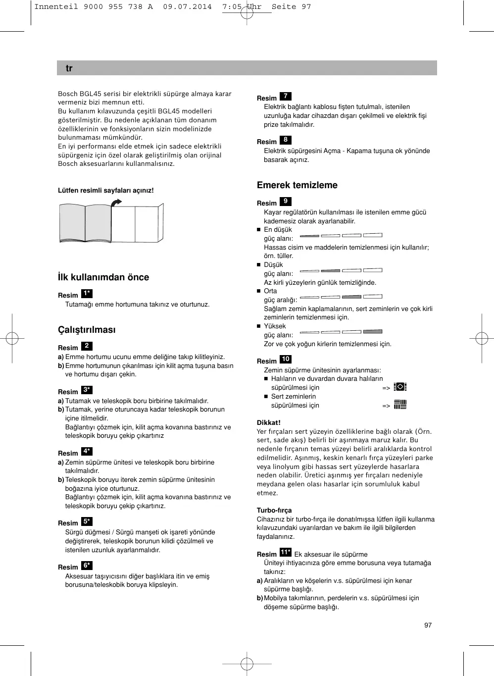 Aveţi grijă ca ştecărul să nu se lovească de persoane, părţi ale corpului, animale sau obiecte la retractarea automată. => Ghidaţi cablul de racordare la reţea cu ajutorul ştecărului. Nu trageţi şi nu striviţi cablul de legătură la reţea peste muchii ascuţite. Scoateţi aspiratorul din priză înaintea oricărei lucrări la el. Nu puneţi în funcţiune un aspirator dacă este deteriorat. În cazul existenţei unui deranjament scoateţi ştecherul din priză. Düsen je nach Bedarf auf Saugrohr oder Handgriff stecken: a) Fugendüse zum Absaugen von Fugen und Ecken, etc. b)Polsterdüse zum Absaugen von Polstermöbeln, Vorhängen, etc. Bild 12* Congratulations on your purchase of a Bosch BGL45 vacuum cleaner. This instruction manual describes various BGL45 models, which means that some of the equipment features and functions described may not be available on your model. You should only use original Bosch accessories, which have been specially developed for your vacuum cleaner to achieve the best possible vacuuming results.