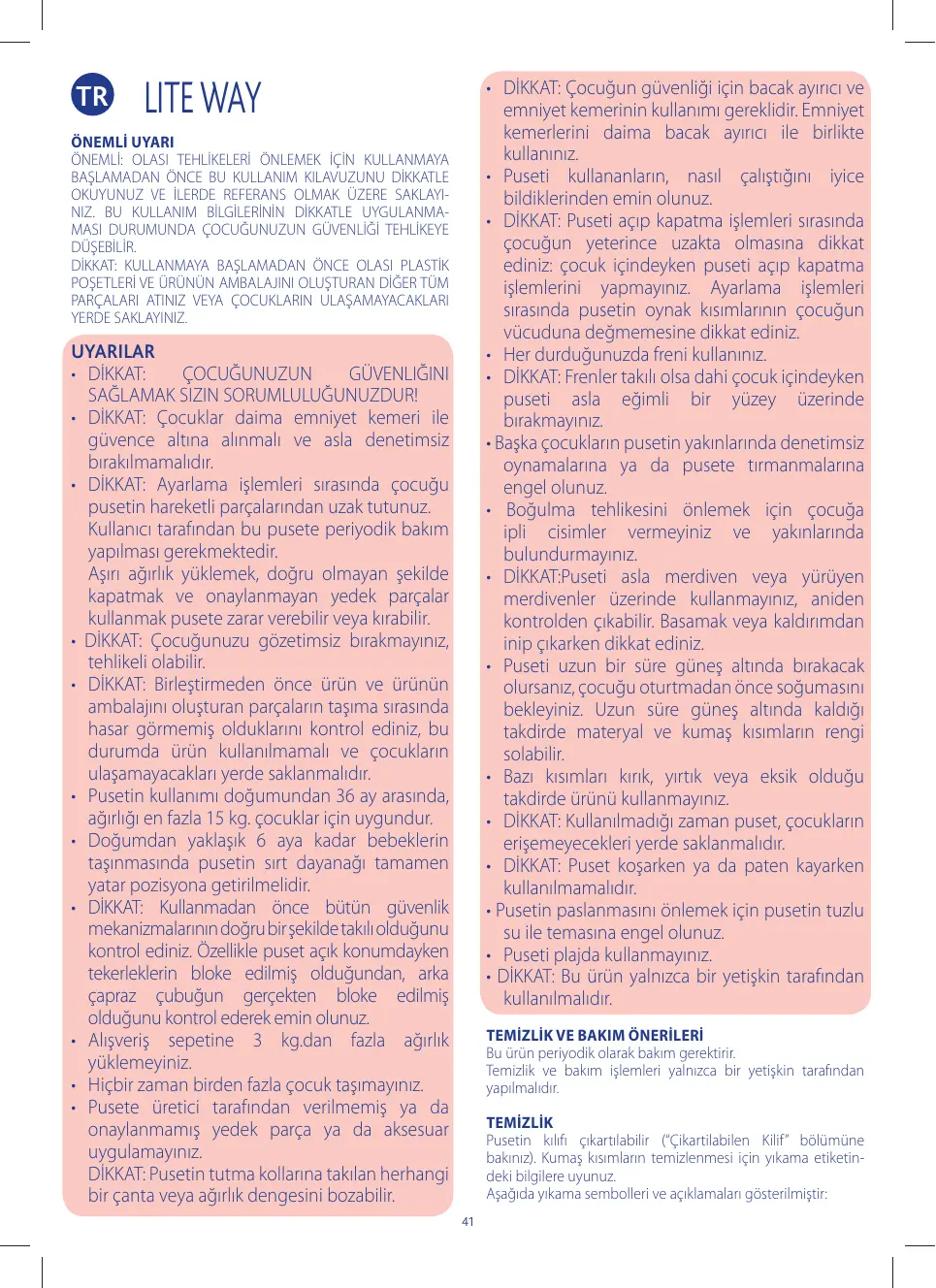 CONSEILS POUR LE NETTOYAGE ET L’ENTRETIEN Ce produit a besoin d’un entretien régulier. Les opérations de nettoyage et d’entretien doivent être réalisées uniquement par un adulte.