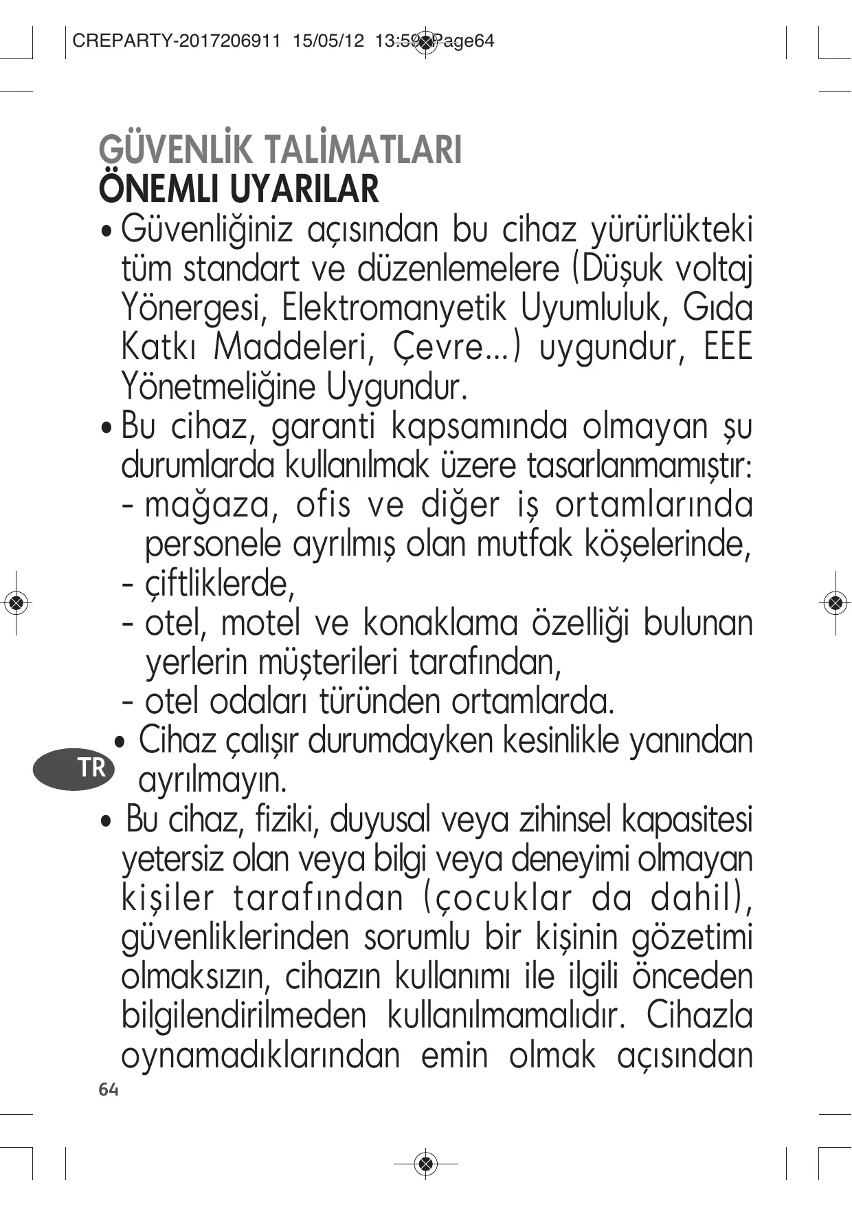 GÜVENLİK TALİMATLARI ÖNEMLI UYARILAR • Güvenliğiniz açısından bu cihaz yürürlükteki tüm standart ve düzenlemelere (Düşuk voltaj Yönergesi, Elektromanyetik Uyumluluk, Gıda Katkı Maddeleri, Çevre…) uygundur, EEE Yönetmeliğine Uygundur. • Bu cihaz, garanti kapsamında olmayan şu durumlarda kullanılmak üzere tasarlanmamıştır: - mağaza, ofis ve diğer iş ortamlarında personele ayrılmış olan mutfak köşelerinde, - çiftliklerde, - otel, motel ve konaklama özelliği bulunan yerlerin müşterileri tarafından, - otel odaları türünden ortamlarda. • Cihaz çalışır durumdayken kesinlikle yanından TR ayrılmayın. • Bu cihaz, fiziki, duyusal veya zihinsel kapasitesi yetersiz olan veya bilgi veya deneyimi olmayan kişiler tarafından (çocuklar da dahil), güvenliklerinden sorumlu bir kişinin gözetimi olmaksızın, cihazın kullanımı ile ilgili önceden bilgilendirilmeden kullanılmamalıdır. Cihazla oynamadıklarından emin olmak açısından 64