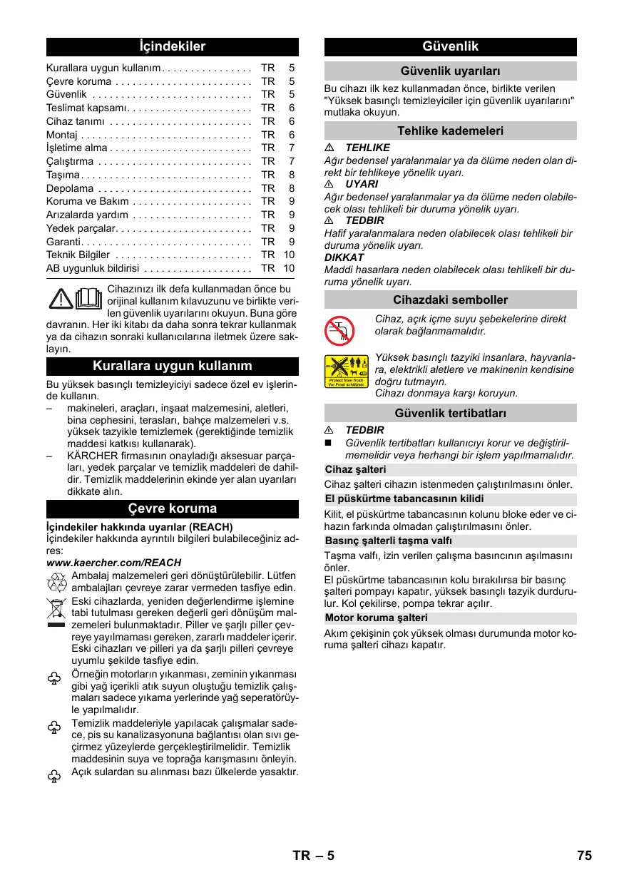 EN 60335–2–79 EN 61000–3–2: 2014 EN 61000–3–3: 2013 EN 62233: 2008 Procedimiento de evaluación de la conformidad aplicado 2000/14/CE: Anexo V Nivel de potencia acústica dB(A) Medido: 88 Garantizado: EN 60335–1 EN 60335–2–79 EN 61000–3–2: 2014 EN 61000–3–3: 2013 EN 62233: 2008 Processo aplicado de avaliação de conformidade 2000/14/CE: Anexo V Nível de potência acústica dB(A) Medido: 88 EN 60335–1 EN 60335–2–79 EN 61000–3–2: 2014 EN 61000–3–3: 2013 EN 62233: 2008 Anvendte overensstemmelsesvurderingsprocedurer 2000/14/EF: Bilag V Lydeffektniveau dB(A) Målt: EN 60335–1 EN 60335–2–79 EN 61000–3–2: 2014 EN 61000–3–3: 2013 EN 62233: 2008 Anvendt metode for samsvarsvurdering 2000/14/EF: Vedlegg V Lydeffektnivå dB(A) Målt: EN 60335–1 EN 60335–2–79 EN 61000–3–2: 2014 EN 61000–3–3: 2013 EN 62233: 2008 Tillämpad metod för överensstämmelsevärdering 2000/14/EG: Bilaga V Ljudeffektsnivå dB(A) Upmätt: EN 60335–1 EN 60335–2–79 EN 61000–3–2: 2014 EN 61000–3–3: 2013 EN 62233: 2008 Sovellettu yhdenmukaisuuden analysointimenetelmä 2000/14/EY: Liite V Äänen tehotaso dB(A) EN 60335–1 EN 60335–2–79 EN 61000–3–2: 2014 EN 61000–3–3: 2013 EN 62233: 2008 Εφαρμοσθείσα διαδικασία συμμόρφωσης 2000/14/EΚ: Παράρτημα V στάθμη ηχητικής πίεσης dB(A) EN 60335–1 EN 60335–2–79 EN 61000–3–2: 2014 EN 61000–3–3: 2013 EN 62233: 2008 Kullanılan uyumluluk değerlendirme yöntemleri 2000/14/EG: Ek V Ses şiddeti dB(A) Ölçülen: 88 EN 60335–1 EN 60335–2–79 EN 61000–3–2: 2014 EN 61000–3–3: 2013 EN 62233: 2008 Примененный порядок оценки соответствия 2000/14/ЕС: Приложение V Уровень мощности звука dB(A) EN 60335–1 EN 60335–2–79 EN 61000–3–2: 2014 EN 61000–3–3: 2013 EN 62233: 2008 Követett megfelelés megállapítási eljárás: 2000/14/EK: V. függelék Hangteljesítményszint dB(A) EN 60335–1 EN 60335–2–79 EN 61000–3–2: 2014 EN 61000–3–3: 2013 EN 62233: 2008 Použitý postup posuzování shody: 2000/14/ES: Příloha V Hladinu akustického dB(A) Namerenou: EN 60335–1 EN 60335–2–79 EN 61000–3–2: 2014 EN 61000–3–3: 2013 EN 62233: 2008 Postopek ocenjevanja skladnosti: 2000/14/ES: Priloga V Raven zvočne moči dB(A) Izmerjeno: EN 60335–1 EN 60335–2–79 EN 61000–3–2: 2014 EN 61000–3–3: 2013 EN 62233: 2008 Zastosowana metoda oceny zgodności 2000/14/WE: Załącznik V Poziom mocy akustycznej dB(A) Zmierzony: Trepte de pericol  PERICOL Indicaţie referitoare la un pericol iminent, care duce la vătămări corporale grave sau moarte. 몇 AVERTIZARE Indicaţie referitoare la o posibilă situaţie periculoasă, care ar putea duce la vătămări corporale grave sau moarte. 몇 PRECAUŢIE Indică o posibilă situaţie periculoasă, care ar putea duce la vătămări corporale uşoare. ATENŢIE Indicaţie referitoare la o posibilă situaţie periculoasă, care ar putea duce la pagube materiale.  Conectaţi furtunul de apă la sursa de alimentare cu apă.  Deschideţi robinetul de apă în totalitate. Aspirarea apei din rezervoare deschise Acest aparat de curăţat sub presiune poate fi folosit cu furtunul de absorbţie KÄRCHER cu supapă de refulare (accesoriu special, nr. de comandă 2.643-100) şi este adecvat pentru aspirarea apei de la suprafaţă, de ex. din rezervoare cu apă de ploaie sau din iazuri (înălţimea maximă de aspirare vezi Datele tehnice). Indicaţie: În regim de aspirare nu este nevoie de cuplajul racordului de apă.  Umpleţi cu apă furtunul de aspirare.  Înşurubaţi furtunul de aspirare pe racordul de apă al aparatului şi atârnaţi-l într-un recipient cu apă (de ex. rezervorul de apă de ploaie). Evacuaţi aerul înainte de a utiliza aparatul după cum urmează:  Porniţi aparatul „I/ON“.  Deblocaţi maneta pistolului de pulverizat.  Apăsaţi maneta pistolului manual de pulverizat, aparatul porneşte.  Mizeria desprinsă se spală cu jetul de înaltă presiune. După utilizarea cu soluţie de curăţat  Scoateţi flaconul Plug 'n' Clean din suport şi închideţi-l cu dop.  Pentru depozitare aşezaţi flaconul de soluţie de curăţat cu dopul în sus în suport.