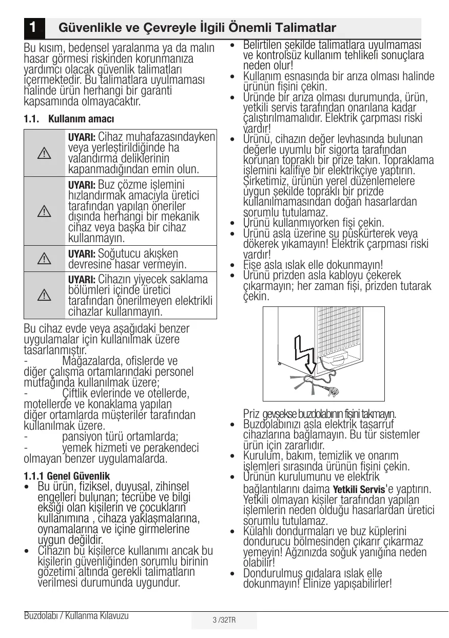 3 /32TR cihazlarına bağlamayın. Bu tür sistemler ürün için zararlıdır. Kurulum, bakım, temizlik ve onarım işlemleri sırasında ürünün fişini çekin. Ürünün kurulumunu ve elektrik bağlantılarını daima Yetkili Servis'e yaptırın. Yetkili olmayan kişiler tarafından yapılan işlemlerin neden olduğu hasarlardan üretici sorumlu tutulamaz. Külahlı dondurmaları ve buz küplerini dondurucu bölmesinden çıkarır çıkarmaz yemeyin! Ağzınızda soğuk yanığına neden olabilir! Dondurulmuş gıdalara ıslak elle dokunmayın! Elinize yapışabilirler! Güvenlik ve çevre talimatları