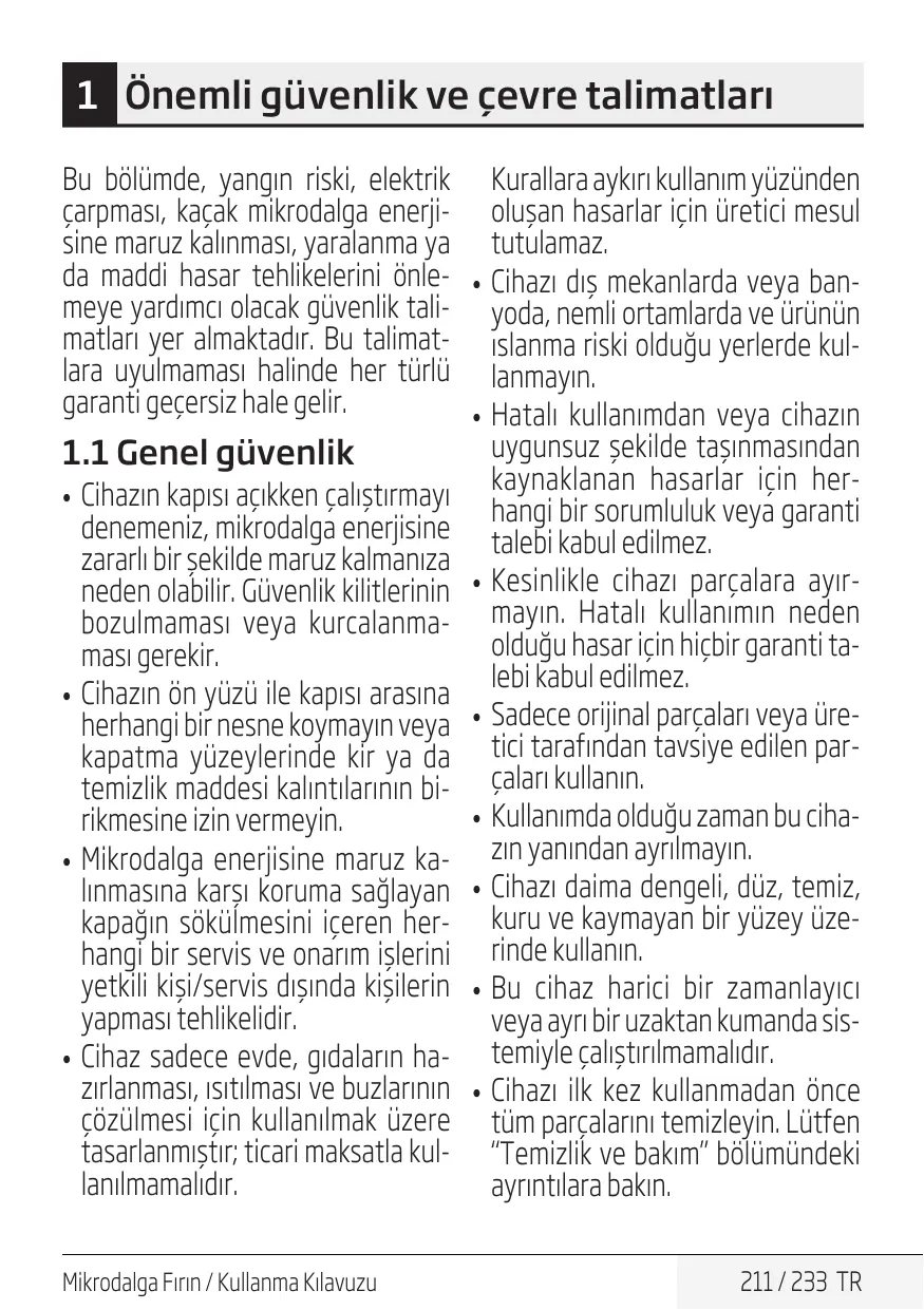 1 Önemli güvenlik ve çevre talimatları Bu bölümde, yangın riski, elektrik çarpması, kaçak mikrodalga enerjisine maruz kalınması, yaralanma ya da maddi hasar tehlikelerini önlemeye yardımcı olacak güvenlik talimatları yer almaktadır. Bu talimatlara uyulmaması halinde her türlü garanti geçersiz hale gelir.