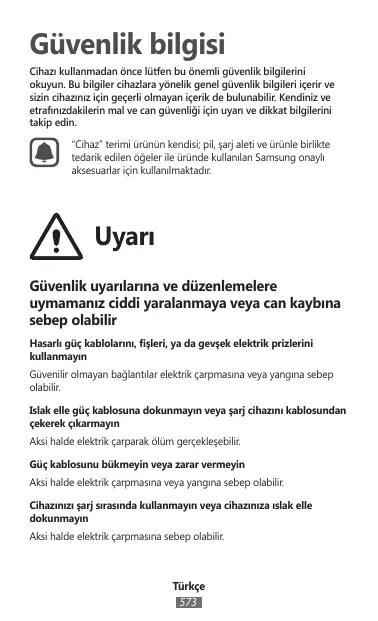 Le non-respect des consignes de sécurité peut entraîner des blessures graves, voire la mort N’utilisez pas de prises et de cordons d’alimentation endommagé(e)s ou de prises électriques mal fixées Les branchements non sécurisés engendrent un risque d’électrocution ou d’incendie. Ne touchez pas le cordon d’alimentation avec les mains mouillées et ne déconnectez pas le chargeur en tirant sur le cordon Vous risquez de vous électrocuter. Ne tordez et n’endommagez pas le cordon d’alimentation Vous risquez de vous électrocuter ou de provoquer un incendie. N’utilisez pas l’appareil avec les mains mouillées ou lorsque celui-ci est en cours de chargement Vous risquez de vous électrocuter.