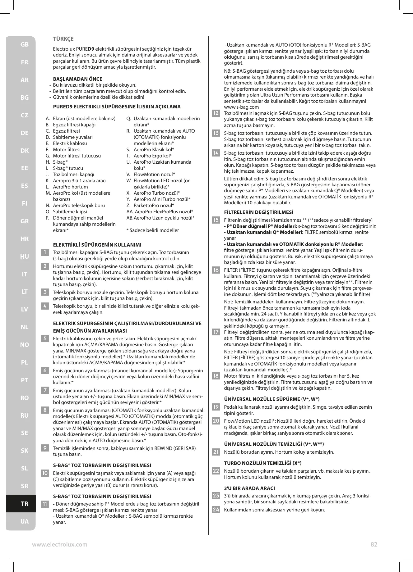 - Uzaktan kumandalı ve AUTO (OTO) fonksiyonlu R* Modelleri: S-BAG gösterge ışıkları kırmızı renkte yanar (yeşil ışık: torbanın iyi durumda olduğunu, sarı ışık: torbanın kısa sürede değiştirilmesi gerektiğini gösterir). Electrolux PURED9 elektrikli süpürgesini seçtiğiniz için teşekkür ederiz. En iyi sonucu almak için daima orijinal aksesuarlar ve yedek parçalar kullanın. Bu ürün çevre bilinciyle tasarlanmıştır. Tüm plastik parçalar geri dönüşüm amacıyla işaretlenmiştir. 16 FILTER (FİLTRE) tuşunu çekerek filtre kapağını açın. Orijinal s-filtre