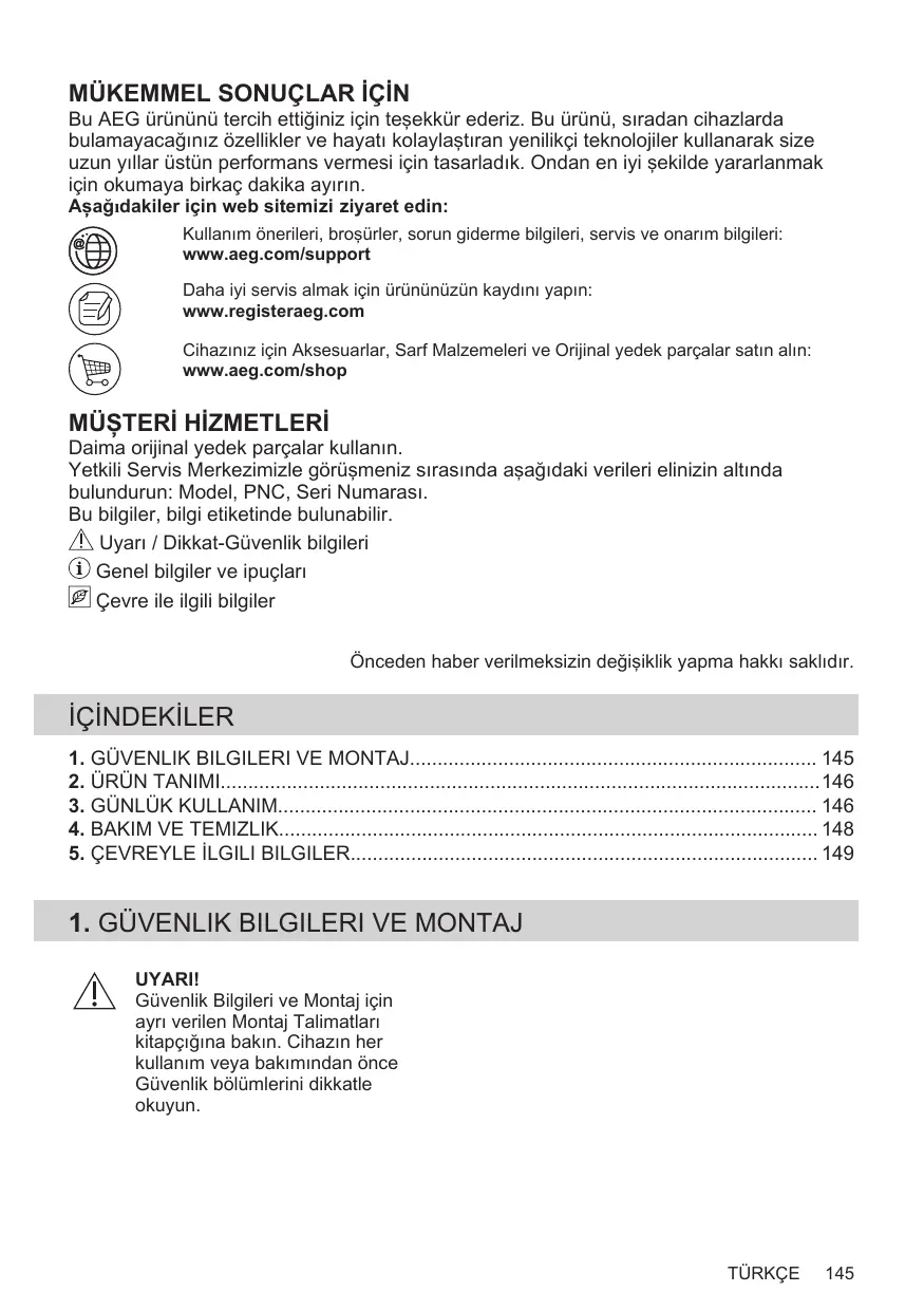 2 Obtenir des conseils d’utilisation, des brochures, un dépanneur, des informations sur le service et les réparations : www.aeg.com/support Enregistrer votre produit pour un meilleur service : www.registeraeg.com Acheter des accessoires, consommables et pièces de rechange d’origine pour votre appareil : www.aeg.com/shop