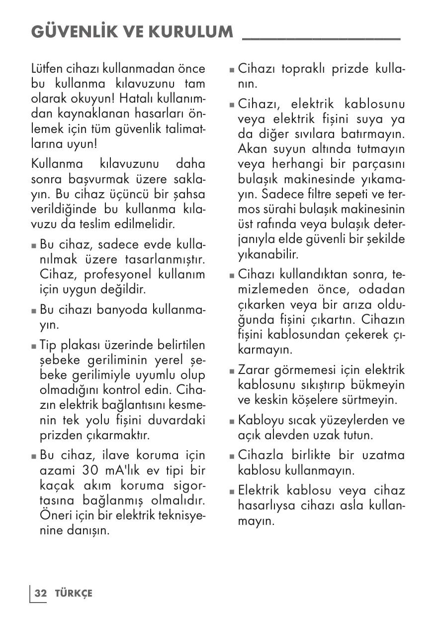 GÜVENLİK VE KURULUM_ __________________ Lütfen cihazı kullanmadan önce bu kullanma kılavuzunu tam olarak okuyun! Hatalı kullanımdan kaynaklanan hasarları önlemek için tüm güvenlik talimatlarına uyun! Kullanma kılavuzunu daha sonra başvurmak üzere saklayın. Bu cihaz üçüncü bir şahsa verildiğinde bu kullanma kılavuzu da teslim edilmelidir. Bu cihaz, sadece evde kullanılmak üzere tasarlanmıştır. Cihaz, profesyonel kullanım için uygun değildir. Bu cihazı banyoda kullanmayın. Tip plakası üzerinde belirtilen şebeke geriliminin yerel şebeke gerilimiyle uyumlu olup olmadığını kontrol edin. Cihazın elektrik bağlantısını kesmenin tek yolu fişini duvardaki prizden çıkarmaktır. Bu cihaz, ilave koruma için azami 30 mA'lık ev tipi bir kaçak akım koruma sigortasına bağlanmış olmalıdır. Öneri için bir elektrik teknisyenine danışın.