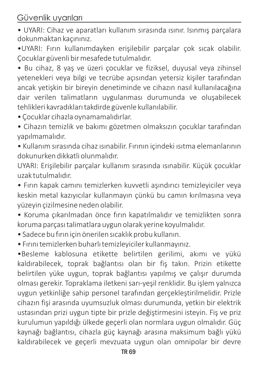 Güvenlik uyarıları • UYARI: Cihaz ve aparatları kullanım sırasında ısınır. Isınmış parçalara dokunmaktan kaçınınız. •UYARI: Fırın kullanımdayken erişilebilir parçalar çok sıcak olabilir. Çocuklar güvenli bir mesafede tutulmalıdır. • Bu cihaz, 8 yaş ve üzeri çocuklar ve fiziksel, duyusal veya zihinsel yetenekleri veya bilgi ve tecrübe açısından yetersiz kişiler tarafından ancak yetişkin bir bireyin denetiminde ve cihazın nasıl kullanılacağına dair verilen talimatların uygulanması durumunda ve oluşabilecek tehlikleri kavradıkları takdirde güvenle kullanılabilir. • Çocuklar cihazla oynamamalıdırlar. • Cihazın temizlik ve bakımı gözetmen olmaksızın çocuklar tarafından yapılmamalıdır. • Kullanım sırasında cihaz ısınabilir. Fırının içindeki ısıtma elemanlarının dokunurken dikkatli olunmalıdır. UYARI: Erişilebilir parçalar kullanım sırasında ısınabilir. Küçük çocuklar uzak tutulmalıdır. • Fırın kapak camını temizlerken kuvvetli aşındırıcı temizleyiciler veya keskin metal kazıyıcılar kullanmayın çünkü bu camın kırılmasına veya yüzeyin çizilmesine neden olabilir. • Koruma çıkarılmadan önce fırın kapatılmalıdır ve temizlikten sonra koruma parçası talimatlara uygun olarak yerine koyulmalıdır. • Sadece bu fırın için önerilen sıcaklık probu kullanın. • Fırını temizlerken buharlı temizleyiciler kullanmayınız. •Besleme kablosuna etikette belirtilen gerilimi, akımı ve yükü kaldırabilecek, toprak bağlantısı olan bir fiş takın. Prizin etikette belirtilen yüke uygun, toprak bağlantısı yapılmış ve çalışır durumda olması gerekir. Topraklama iletkeni sarı-yeşil renklidir. Bu işlem yalnızca uygun yetkinliğe sahip personel tarafından gerçekleştirilmelidir. Prizle cihazın fişi arasında uyumsuzluk olması durumunda, yetkin bir elektrik ustasından prizi uygun tipte bir prizle değiştirmesini isteyin. Fiş ve priz kurulumun yapıldığı ülkede geçerli olan normlara uygun olmalıdır. Güç kaynağı bağlantısı, cihazla güç kaynağı arasına maksimum bağlı yükü kaldırabilecek ve geçerli mevzuata uygun olan omnipolar bir devre TR 69