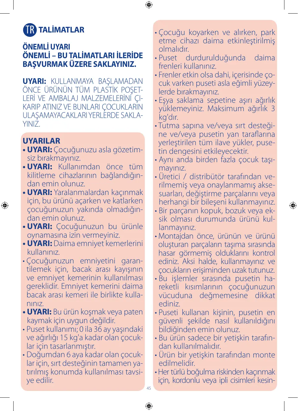 • Faire attention quand on monte ou descend le trottoir. • En cas d’exposition prolongée au soleil, attendre que la poussette refroidisse avant d’y positionner l’enfant. Une exposition prolongée au soleil peut provoquer des variations de couleur des matériaux et des tissus. • Éviter tout contact de la poussette avec de l’eau salée pour empêcher la formation de rouille. • Ne pas utiliser la poussette à la plage. • Lorsque la poussette n’est pas utilisée, la ranger hors de portée des enfants.