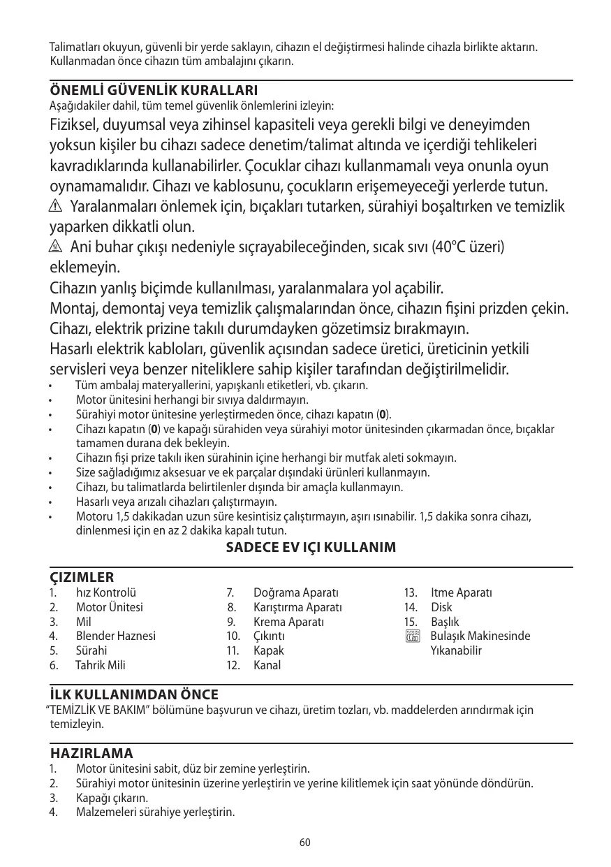 Tüm ambalaj materyallerini, yapışkanlı etiketleri, vb. çıkarın. Motor ünitesini herhangi bir sıvıya daldırmayın. Sürahiyi motor ünitesine yerleştirmeden önce, cihazı kapatın (0). Cihazı kapatın (0) ve kapağı sürahiden veya sürahiyi motor ünitesinden çıkarmadan önce, bıçaklar tamamen durana dek bekleyin. Cihazın fişi prize takılı iken sürahinin içine herhangi bir mutfak aleti sokmayın. Size sağladığımız aksesuar ve ek parçalar dışındaki ürünleri kullanmayın. Cihazı, bu talimatlarda belirtilenler dışında bir amaçla kullanmayın. Hasarlı veya arızalı cihazları çalıştırmayın. Motoru 1,5 dakikadan uzun süre kesintisiz çalıştırmayın, aşırı ısınabilir. 1,5 dakika sonra cihazı, dinlenmesi için en az 2 dakika kapalı tutun.