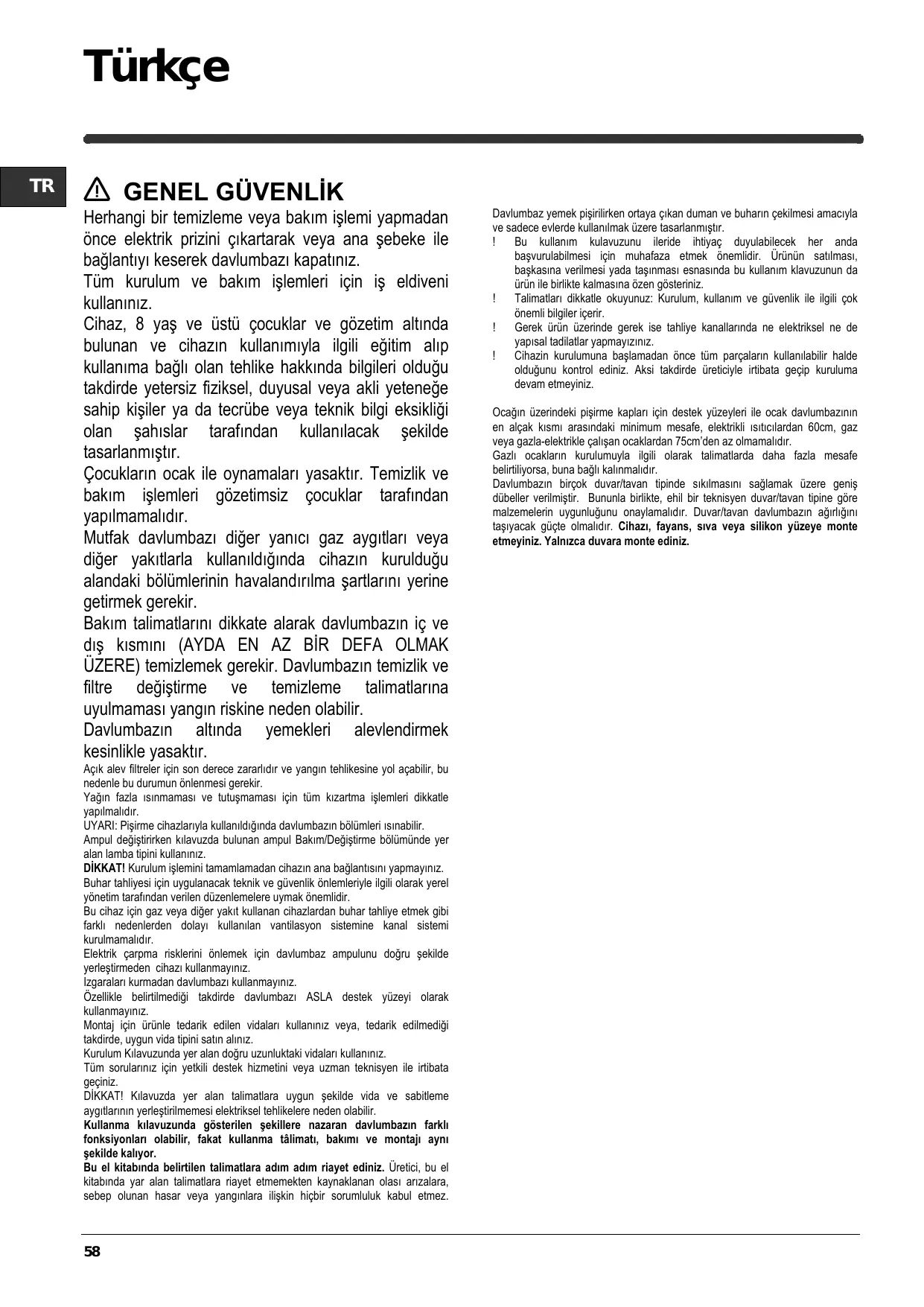 La pièce doit avoir une aération suffisante lorsque la hotte est utilisée conjointement avec d'autres appareils fonctionnant au gaz ou autres combustibles. La hotte doit être régulièrement nettoyée à la fois à l'intérieur et à l'extérieur (AU MOINS UNE FOIS PAR MOIS); cela devrait se faire en conformité avec les instructions d'entretien. Le non respect des instructions expressément fournies concernant le nettoyage de la hotte et des filtres peut provoquer des risques d'incendie. Ne pas flamber d’aliments sous la hotte.