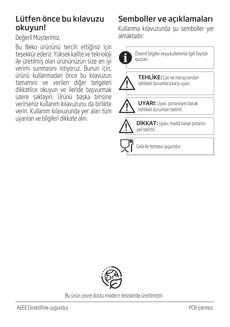 65 / FR Lütfen önce bu kılavuzu okuyun! Değerli Müşterimiz, Bu Beko ürününü tercih ettiğiniz için teşekkür ederiz. Yüksek kalite ve teknoloji ile üretilmiş olan ürününüzün size en iyi verimi sunmasını istiyoruz. Bunun için, ürünü kullanmadan önce bu kılavuzun tamamını ve verilen diğer belgeleri dikkatlice okuyun ve ileride başvurmak üzere saklayın. Ürünü başka birisine verirseniz kullanım kılavuzunu da birlikte verin. Kullanım kılavuzunda yer alan tüm uyarıları ve bilgileri dikkate alın.