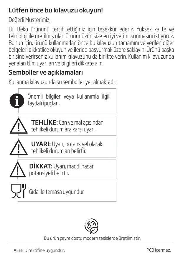 Lütfen önce bu kılavuzu okuyun! Değerli Müşterimiz, Bu Beko ürününü tercih ettiğiniz için teşekkür ederiz. Yüksek kalite ve teknoloji ile üretilmiş olan ürününüzün size en iyi verimi sunmasını istiyoruz. Bunun için, ürünü kullanmadan önce bu kılavuzun tamamını ve verilen diğer belgeleri dikkatlice okuyun ve ileride başvurmak üzere saklayın. Ürünü başka birisine verirseniz kullanım kılavuzunu da birlikte verin. Kullanım kılavuzunda yer alan tüm uyarıları ve bilgileri dikkate alın. Semboller ve açıklamaları Kullanma kılavuzunda şu semboller yer almaktadır: Önemli bilgiler veya kullanımla ilgili faydalı ipuçları. TEHLİKE: Can ve mal açısından tehlikeli durumlara karşı uyarı. UYARI: Uyarı, potansiyel olarak tehlikeli durumları belirtir. DİKKAT: Uyarı, maddi hasar potansiyeli belirtir. Gıda ile temasa uygundur.