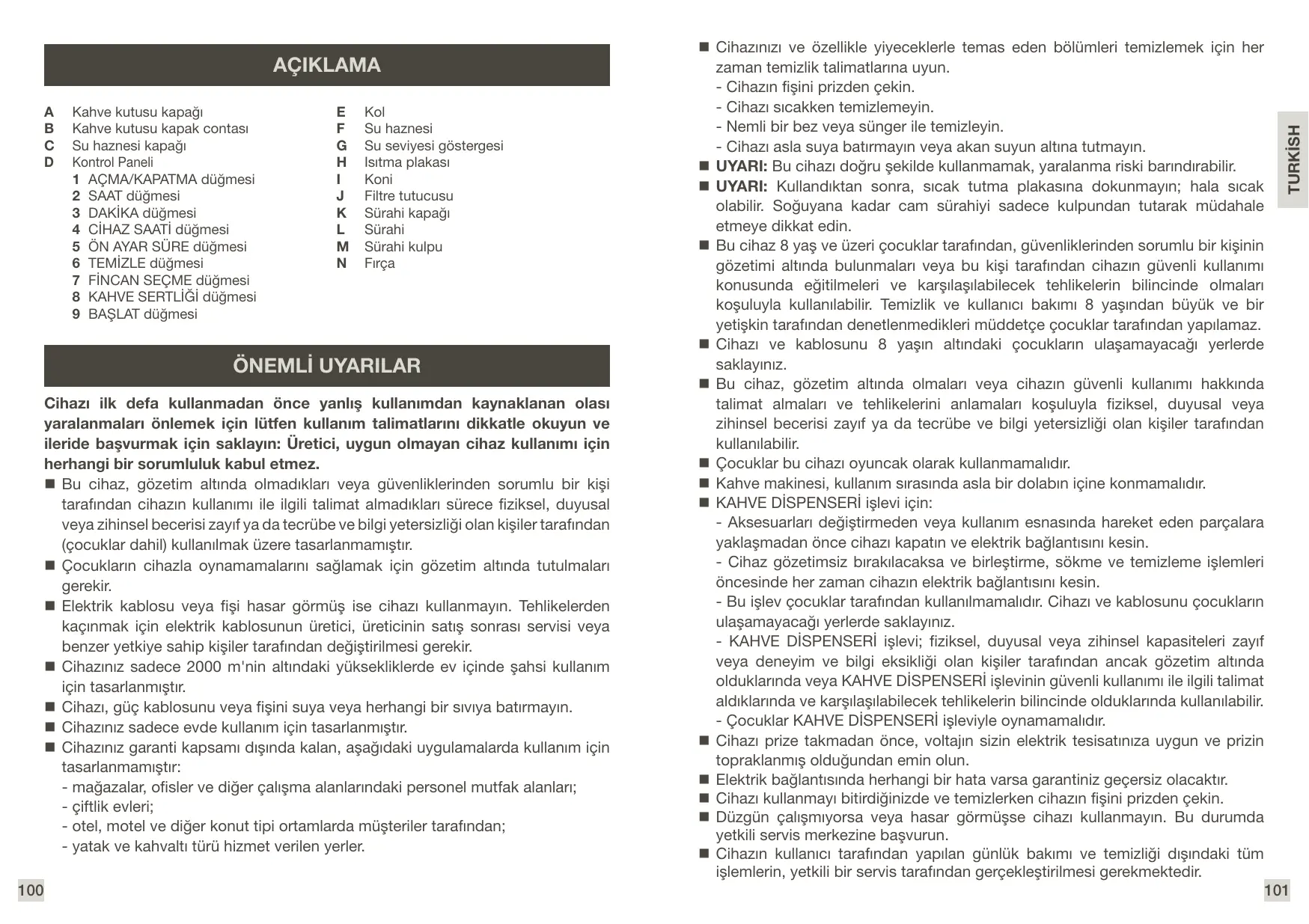 ÖNEMLİ UYARILAR Cihazı ilk defa kullanmadan önce yanlış kullanımdan kaynaklanan olası yaralanmaları önlemek için lütfen kullanım talimatlarını dikkatle okuyun ve ileride başvurmak için saklayın: Üretici, uygun olmayan cihaz kullanımı için herhangi bir sorumluluk kabul etmez. Bu cihaz, gözetim altında olmadıkları veya güvenliklerinden sorumlu bir kişi tarafından cihazın kullanımı ile ilgili talimat almadıkları sürece fiziksel, duyusal veya zihinsel becerisi zayıf ya da tecrübe ve bilgi yetersizliği olan kişiler tarafından (çocuklar dahil) kullanılmak üzere tasarlanmamıştır. Çocukların cihazla oynamamalarını sağlamak için gözetim altında tutulmaları gerekir. Elektrik kablosu veya fişi hasar görmüş ise cihazı kullanmayın. Tehlikelerden kaçınmak için elektrik kablosunun üretici, üreticinin satış sonrası servisi veya benzer yetkiye sahip kişiler tarafından değiştirilmesi gerekir. Cihazınız sadece 2000 m'nin altındaki yüksekliklerde ev içinde şahsi kullanım için tasarlanmıştır. Cihazı, güç kablosunu veya fişini suya veya herhangi bir sıvıya batırmayın. Cihazınız sadece evde kullanım için tasarlanmıştır. Cihazınız garanti kapsamı dışında kalan, aşağıdaki uygulamalarda kullanım için tasarlanmamıştır: - mağazalar, ofisler ve diğer çalışma alanlarındaki personel mutfak alanları; - çiftlik evleri; - otel, motel ve diğer konut tipi ortamlarda müşteriler tarafından; - yatak ve kahvaltı türü hizmet verilen yerler. 100
