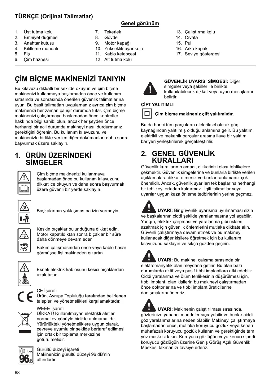 14. Le niveau sonore de votre outil ne dépasse pas 96 dB. SYMBOLE D’ALERTE DE SÉCURITÉ : Indique qu’une précaution ou une mise en garde peut être utilisée avec d’autres symboles ou images. DOUBLE ISOLATION Votre tondeuse est doublement isolée. Cela signifie que toutes les parties externes sont isolées électriquement de l’alimentation. Pour cela, une barrière d’isolation supplémentaire est placée entre les parties électriques et mécaniques.