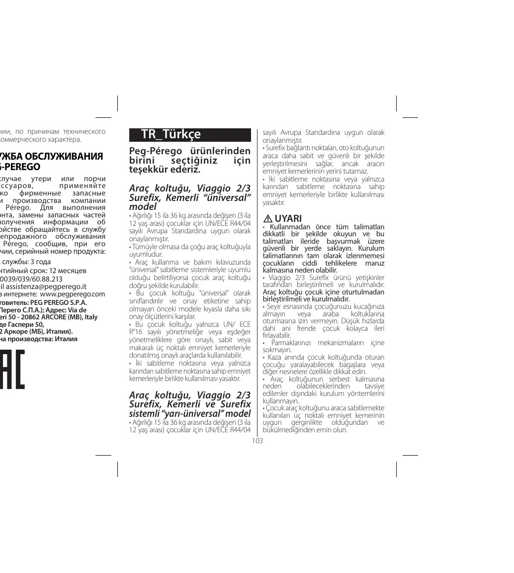 e attentivement les instructions nt l'utilisation et bien les server pour les consulter rieurement. Le non-respect des uctions pour l'installation du e-auto, entraînerait des risques r votre bébé. s opérations de montage et tallation de Viaggio 2/3 Surefix ent être effectuées par des es. L'opération de montage et stallation doit être effectuée l'enfant dans le siège-auto. ndant les voyages en voiture, ne is tenir le bébé dans ses bras, et ne is l'installer en dehors du siège. En e freinage brusque, même à faible e, l'enfant pourrait facilement être pulté vers l'avant. er d'introduire les doigts dans les anismes. voiture faire très attention aux ges ou autres objets qui pourraient er des lésions à l'enfant dans le e-auto en cas d'accident.