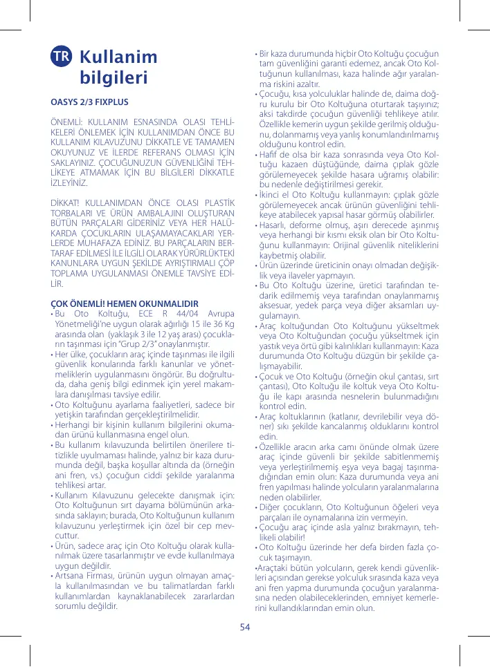 LIRE ATTENTIVEMENT ET ENTIÈREMENT CETTE NOTICE POUR ÉVITER TOUT DANGER ET LA CONSERVER POUR TOUTE RÉFÉRENCE FUTURE. POUR NE PAS COMPROMETTRE LA SÉCURITÉ DE VOTRE ENFANT, SUIVEZ ATTENTIVEMENT CES INSTRUCTIONS. ATTENTION ! AVANT D’UTILISER LE PRODUIT, ÔTER ET ÉLIMINER TOUS LES SACHETS EN PLASTIQUE ÉVENTUELS ET TOUS LES ÉLÉMENTS COMPOSANT L’EMBALLAGE DU PRODUIT ET LES TENIR HORS DE PORTÉE DES ENFANTS. IL EST CONSEILLÉ D’ÉLIMINER CES ÉLÉMENTS EN FAISANT LE TRI SÉLECTIF CONFORMÉMENT AUX LOIS EN VIGUEUR. TRÈS IMPORTANT ! À LIRE IMMÉDIATEMENT • Ce siège-auto est homologué “Groupe 2/3”, pour le transport d’enfants de 15 à 36 Kg (de 3 à 12 ans de façon indicative), conformément au règlement européen ECE R 44/04. • Chaque pays applique des lois et des règlements différents en matière de sécurité pour le transport des enfants en voiture. C’est pourquoi il est conseillé de contacter les autorités locales pour obtenir davantage d’informations. • Les activités de réglage du siège-auto doivent être effectuées exclusivement par un adulte. • Éviter que quiconque utilise le produit sans avoir lu la notice. • Le risque de blessures de l’enfant, non seulement en cas d’accident mais aussi dans d’autres circonstances (par ex. freinages brusques, etc.) augmente si les indications de cette notice ne sont pas suivies scrupuleusement. • Conserver la Notice pour toute référence future : une poche permettant de ranger la notice se trouve derrière le dossier du siège auto. • Le produit doit être utilisé exclusivement comme siège-auto et ne doit pas être utilisé à la maison. • La société Artsana décline toute responsabilité en cas d’utilisation incorrecte du produit et pour toute utilisation différente de cette notice. • Aucun siège-auto ne peut garantir la sécurité totale de l’enfant en cas d’accident, mais son utilisation réduit le risque de blessures graves. • Transporter un enfant dans un siège-auto correctement installé, même lors de trajets brefs ; dans le cas contraire, cela pourrait nuire à sa sécurité. Vérifier notamment que la ceinture est correcte-