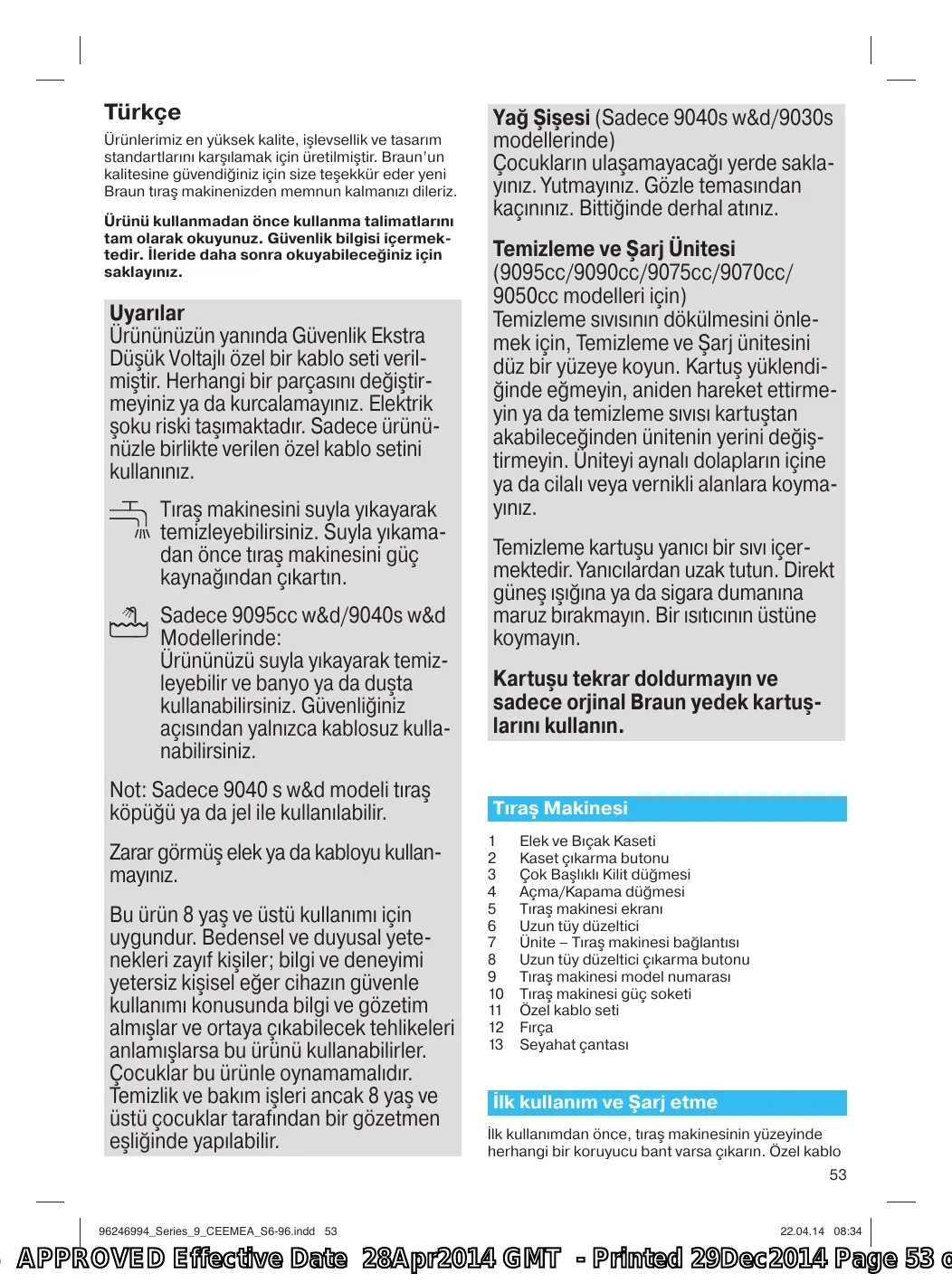 Uyarılar Ürününüzün yanında Güvenlik Ekstra Düşük Voltajlı özel bir kablo seti verilmiştir. Herhangi bir parçasını değiştirmeyiniz ya da kurcalamayınız. Elektrik şoku riski taşımaktadır. Sadece ürününüzle birlikte verilen özel kablo setini kullanınız. Tıraş makinesini suyla yıkayarak temizleyebilirsiniz. Suyla yıkamadan önce tıraş makinesini güç kaynağından çıkartın. Sadece 9095cc w&d/9040s w&d Modellerinde: Ürününüzü suyla yıkayarak temizleyebilir ve banyo ya da duşta kullanabilirsiniz. Güvenliğiniz açısından yalnızca kablosuz kullanabilirsiniz. Not: Sadece 9040 s w&d modeli tıraş köpüğü ya da jel ile kullanılabilir. Zarar görmüş elek ya da kabloyu kullanmayınız. Bu ürün 8 yaş ve üstü kullanımı için uygundur. Bedensel ve duyusal yetenekleri zayıf kişiler; bilgi ve deneyimi yetersiz kişisel eğer cihazın güvenle kullanımı konusunda bilgi ve gözetim almışlar ve ortaya çıkabilecek tehlikeleri anlamışlarsa bu ürünü kullanabilirler. Çocuklar bu ürünle oynamamalıdır. Temizlik ve bakım işleri ancak 8 yaş ve üstü çocuklar tarafından bir gözetmen eşliğinde yapılabilir.