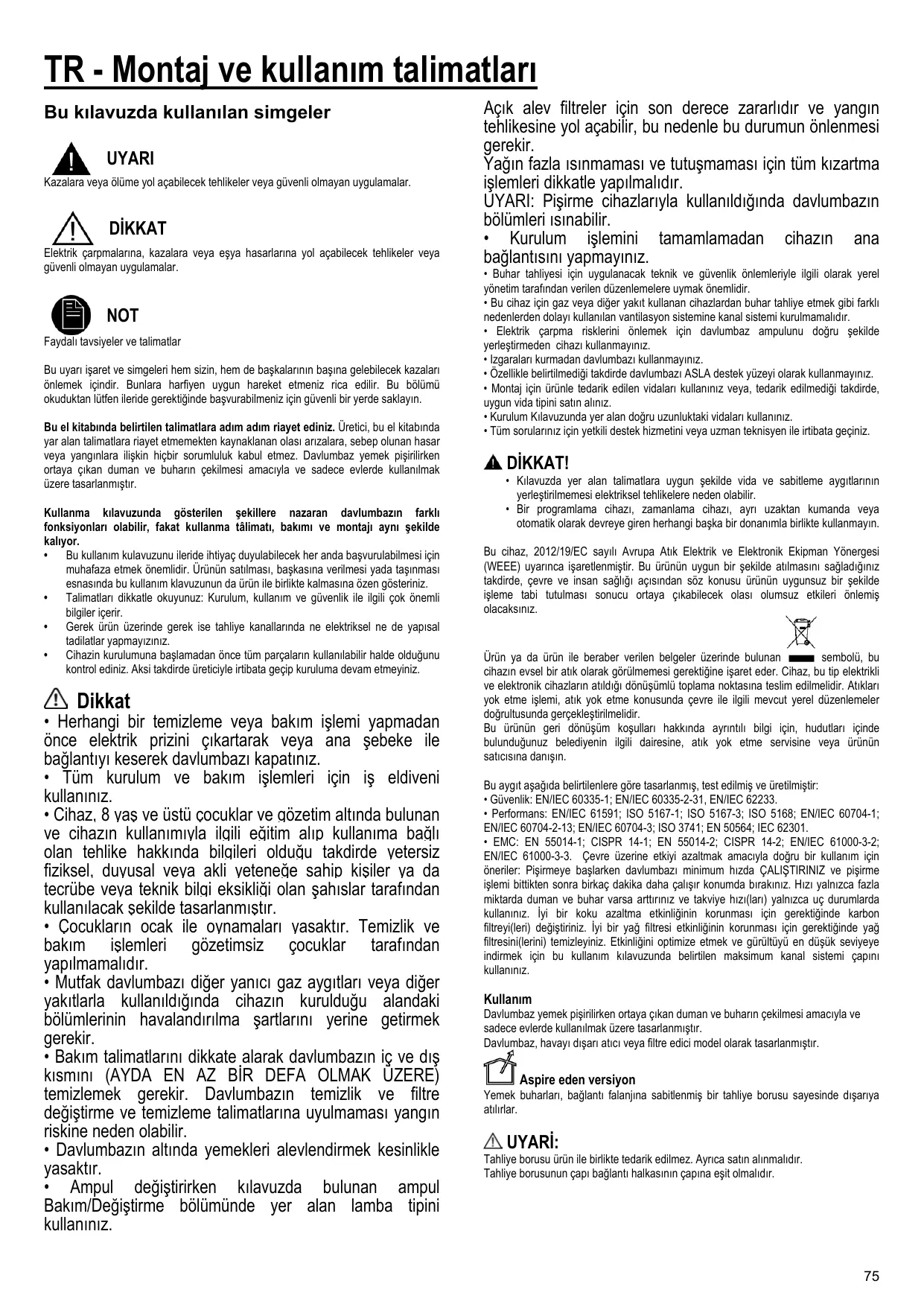 sembolü, bu Ürün ya da ürün ile beraber verilen belgeler üzerinde bulunan cihazın evsel bir atık olarak görülmemesi gerektiğine işaret eder. Cihaz, bu tip elektrikli ve elektronik cihazların atıldığı dönüşümlü toplama noktasına teslim edilmelidir. Atıkları yok etme işlemi, atık yok etme konusunda çevre ile ilgili mevcut yerel düzenlemeler doğrultusunda gerçekleştirilmelidir. Bu ürünün geri dönüşüm koşulları hakkında ayrıntılı bilgi için, hudutları içinde bulunduğunuz belediyenin ilgili dairesine, atık yok etme servisine veya ürünün satıcısına danışın. Bu aygıt aşağıda belirtilenlere göre tasarlanmış, test edilmiş ve üretilmiştir: • Güvenlik: EN/IEC 60335-1; EN/IEC 60335-2-31, EN/IEC 62233. • Performans: EN/IEC 61591; ISO 5167-1; ISO 5167-3; ISO 5168; EN/IEC 60704-1; EN/IEC 60704-2-13; EN/IEC 60704-3; ISO 3741; EN 50564; IEC 62301. • EMC: EN 55014-1; CISPR 14-1; EN 55014-2; CISPR 14-2; EN/IEC 61000-3-2; EN/IEC 61000-3-3. Çevre üzerine etkiyi azaltmak amacıyla doğru bir kullanım için öneriler: Pişirmeye başlarken davlumbazı minimum hızda ÇALIŞTIRINIZ ve pişirme işlemi bittikten sonra birkaç dakika daha çalışır konumda bırakınız. Hızı yalnızca fazla miktarda duman ve buhar varsa arttırınız ve takviye hızı(ları) yalnızca uç durumlarda kullanınız. İyi bir koku azaltma etkinliğinin korunması için gerektiğinde karbon filtreyi(leri) değiştiriniz. İyi bir yağ filtresi etkinliğinin korunması için gerektiğinde yağ filtresini(lerini) temizleyiniz. Etkinliğini optimize etmek ve gürültüyü en düşük seviyeye indirmek için bu kullanım kılavuzunda belirtilen maksimum kanal sistemi çapını kullanınız.