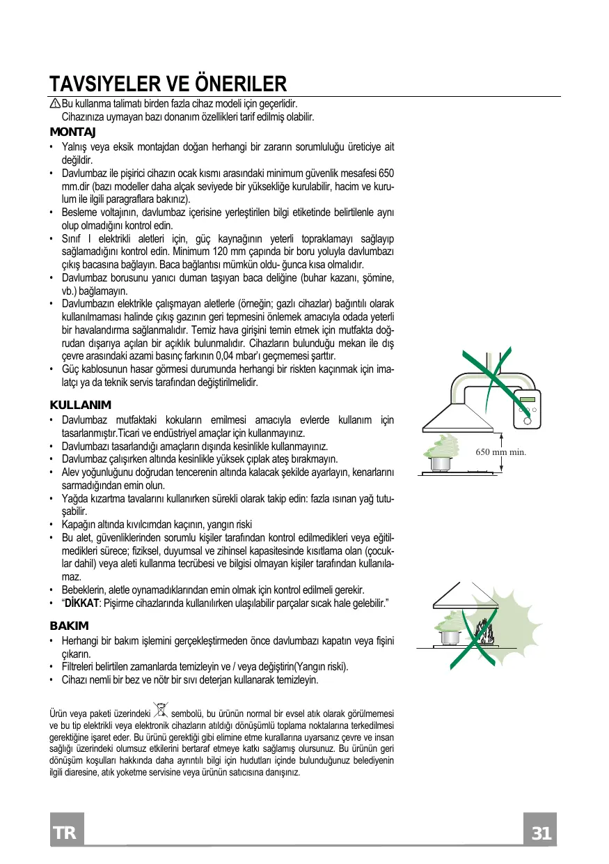 TAVSIYELER VE ÖNERILER Bu kullanma talimatι birden fazla cihaz modeli için geçerlidir. Cihazιnιza uymayan bazι donanιm özellikleri tarif edilmiş olabilir. MONTAJ • Yalnιş veya eksik montajdan doğan herhangi bir zararιn sorumluluğu üreticiye ait değildir. • Davlumbaz ile pişirici cihazιn ocak kιsmι arasιndaki minimum güvenlik mesafesi 650 mm.dir (bazı modeller daha alçak seviyede bir yüksekliğe kurulabilir, hacim ve kurulum ile ilgili paragraflara bakınız). • Besleme voltajιnιn, davlumbaz içerisine yerleştirilen bilgi etiketinde belirtilenle aynι olup olmadιğιnι kontrol edin. • Sιnιf I elektrikli aletleri için, güç kaynağιnιn yeterli topraklamayι sağlayιp sağlamadιğιnι kontrol edin. Minimum 120 mm çapιnda bir boru yoluyla davlumbazι çιkιş bacasιna bağlayιn. Baca bağlantιsι mümkün oldu- ğunca kιsa olmalιdιr. • Davlumbaz borusunu yanιcι duman taşιyan baca deliğine (buhar kazanι, şömine, vb.) bağlamayιn. • Davlumbazιn elektrikle çalιşmayan aletlerle (örneğin; gazlι cihazlar) bağιntιlι olarak kullanιlmamasι halinde çιkιş gazιnιn geri tepmesini önlemek amacιyla odada yeterli bir havalandιrma sağlanmalιdιr. Temiz hava girişini temin etmek için mutfakta doğrudan dιşarιya açιlan bir açιklιk bulunmalιdιr. Cihazların bulunduğu mekan ile dış çevre arasındaki azami basınç farkının 0,04 mbar’ı geçmemesi şarttır. • Güç kablosunun hasar görmesi durumunda herhangi bir riskten kaçınmak için imalatçı ya da teknik servis tarafından değiştirilmelidir. KULLANIM • Davlumbaz mutfaktaki kokularιn emilmesi amacιyla evlerde kullanιm için tasarlanmιştιr.Ticari ve endüstriyel amaçlar için kullanmayιnιz. • Davlumbazι tasarlandιğι amaçlarιn dιşιnda kesinlikle kullanmayιnιz. • Davlumbaz çalιşιrken altιnda kesinlikle yüksek çιplak ateş bιrakmayιn. • Alev yoğunluğunu doğrudan tencerenin altιnda kalacak şekilde ayarlayιn, kenarlarιnι sarmadιğιndan emin olun. • Yağda kιzartma tavalarιnι kullanιrken sürekli olarak takip edin: fazla ιsιnan yağ tutuşabilir. • Kapağın altında kıvılcımdan kaçının, yangın riski • Bu alet, güvenliklerinden sorumlu kişiler tarafından kontrol edilmedikleri veya eğitilmedikleri sürece; fiziksel, duyumsal ve zihinsel kapasitesinde kısıtlama olan (çocuklar dahil) veya aleti kullanma tecrübesi ve bilgisi olmayan kişiler tarafından kullanılamaz. • Bebeklerin, aletle oynamadıklarından emin olmak için kontrol edilmeli gerekir. • “DİKKAT: Pişirme cihazlarında kullanılırken ulaşılabilir parçalar sıcak hale gelebilir.”