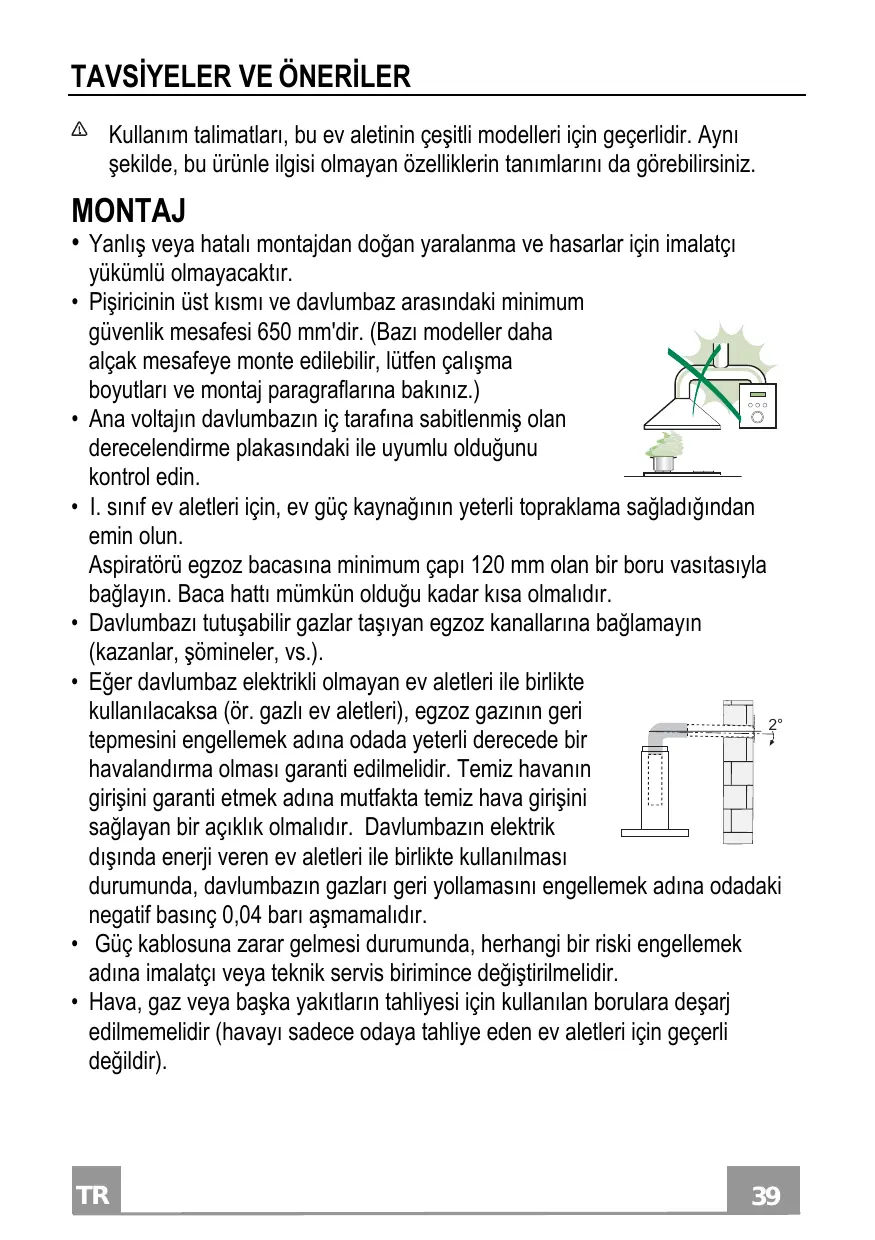 CONSIGLI E SUGGERIMENTI Le Istruzioni per l’uso si riferiscono ai diversi modelli di questo apparecchio. Pertanto, si potrebbero trovare descrizioni di singole caratteristiche che non appartengono al proprio apparecchio specifico. Assurez-vous que la tension de votre secteur correspond à celle indiquée sur la plaque des données appliquée à l’intérieur de la hotte. Pour les appareils de Classe I, s’assurer que l’installation électrique de votre intérieur dispose d’une mise à la terre adéquate. Relier l’aspirateur au conduit de cheminée avec un tube d’un diamètre minimum de 120 mm. Le parcours des fumées doit être le plus court possible. Ne pas relier la hotte aspirante aux conduits de cheminée qui 2° acheminent les fumées de combustion (par exemple de chaudières, de cheminées, etc.). Si vous utilisez l’aspirateur en combinaison avec des appareils non électriques (par ex. appareils à gaz), vous devez garantir un degré d’aération suffisant dans la pièce, afin d’empêcher le retour du flux des gaz de sortie. La cuisine doit présenter une ouverture communiquant directement vers l’extérieur pour garantir l’amenée d’air propre. Si vous utilisez la hotte de cuisine en combinaison avec des appareils non alimentés à l’électricité, la pression négative dans la pièce ne doit pas dépasser 0,04 mbar afin d’éviter que la hotte ne réaspire les fumées dans la pièce. Ne pas évacuer l’air à travers un tube flexible utilisé pour l’aspiration des fumées des appareils alimentés au gaz ou avec d’autres combustibles (ne pas utiliser avec des appareils ayant une seule sortie d’air dans la pièce). Si le cordon d’alimentation est endommagé, veuillez le faire remplacer par le fabricant ou par un service après-vente agréé pour éviter tout risque d’accident.