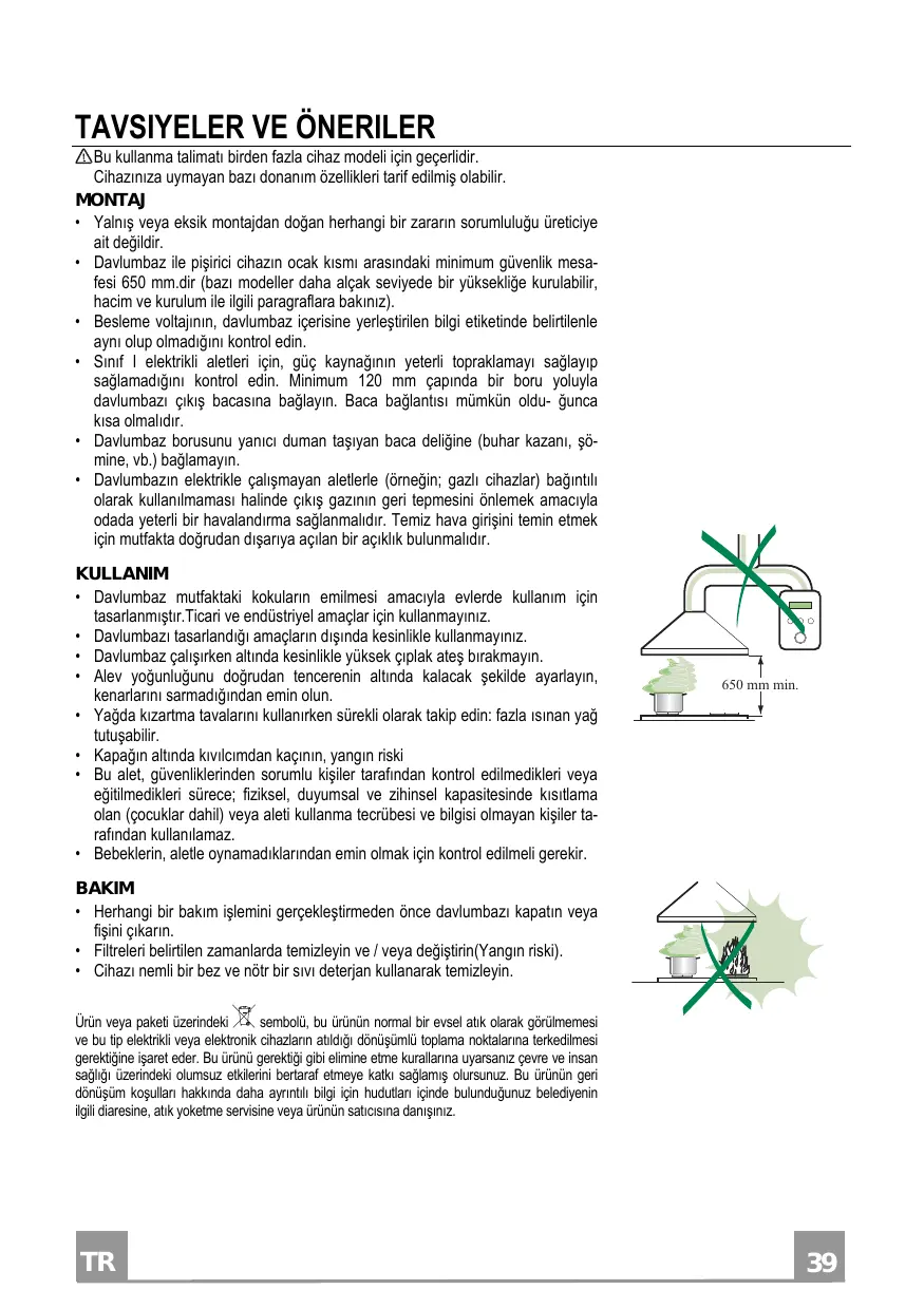 TAVSIYELER VE ÖNERILER Bu kullanma talimatι birden fazla cihaz modeli için geçerlidir. Cihazιnιza uymayan bazι donanιm özellikleri tarif edilmiş olabilir. MONTAJ • Yalnιş veya eksik montajdan doğan herhangi bir zararιn sorumluluğu üreticiye ait değildir. • Davlumbaz ile pişirici cihazιn ocak kιsmι arasιndaki minimum güvenlik mesafesi 650 mm.dir (bazı modeller daha alçak seviyede bir yüksekliğe kurulabilir, hacim ve kurulum ile ilgili paragraflara bakınız). • Besleme voltajιnιn, davlumbaz içerisine yerleştirilen bilgi etiketinde belirtilenle aynι olup olmadιğιnι kontrol edin. • Sιnιf I elektrikli aletleri için, güç kaynağιnιn yeterli topraklamayι sağlayιp sağlamadιğιnι kontrol edin. Minimum 120 mm çapιnda bir boru yoluyla davlumbazι çιkιş bacasιna bağlayιn. Baca bağlantιsι mümkün oldu- ğunca kιsa olmalιdιr. • Davlumbaz borusunu yanιcι duman taşιyan baca deliğine (buhar kazanι, şömine, vb.) bağlamayιn. • Davlumbazιn elektrikle çalιşmayan aletlerle (örneğin; gazlι cihazlar) bağιntιlι olarak kullanιlmamasι halinde çιkιş gazιnιn geri tepmesini önlemek amacιyla odada yeterli bir havalandιrma sağlanmalιdιr. Temiz hava girişini temin etmek için mutfakta doğrudan dιşarιya açιlan bir açιklιk bulunmalιdιr. KULLANIM • Davlumbaz mutfaktaki kokularιn emilmesi amacιyla evlerde kullanιm için tasarlanmιştιr.Ticari ve endüstriyel amaçlar için kullanmayιnιz. • Davlumbazι tasarlandιğι amaçlarιn dιşιnda kesinlikle kullanmayιnιz. • Davlumbaz çalιşιrken altιnda kesinlikle yüksek çιplak ateş bιrakmayιn. • Alev yoğunluğunu doğrudan tencerenin altιnda kalacak şekilde ayarlayιn, kenarlarιnι sarmadιğιndan emin olun. • Yağda kιzartma tavalarιnι kullanιrken sürekli olarak takip edin: fazla ιsιnan yağ tutuşabilir. • Kapağın altında kıvılcımdan kaçının, yangın riski • Bu alet, güvenliklerinden sorumlu kişiler tarafından kontrol edilmedikleri veya eğitilmedikleri sürece; fiziksel, duyumsal ve zihinsel kapasitesinde kısıtlama olan (çocuklar dahil) veya aleti kullanma tecrübesi ve bilgisi olmayan kişiler tarafından kullanılamaz. • Bebeklerin, aletle oynamadıklarından emin olmak için kontrol edilmeli gerekir.