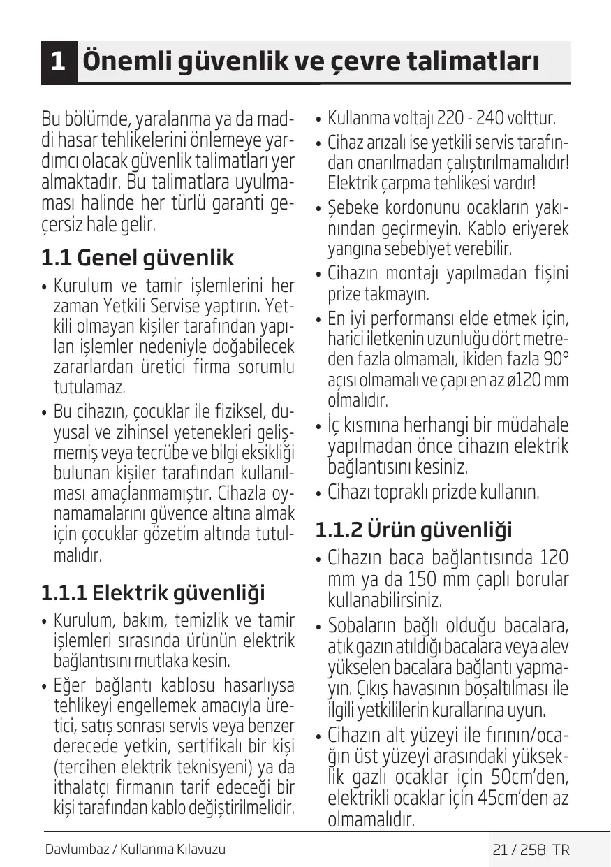 1.1.2 Ürün güvenliği •• Cihazın baca bağlantısında 120 mm ya da 150 mm çaplı borular kullanabilirsiniz. •• Sobaların bağlı olduğu bacalara, atık gazın atıldığı bacalara veya alev yükselen bacalara bağlantı yapmayın. Çıkış havasının boşaltılması ile ilgili yetkililerin kurallarına uyun. •• Cihazın alt yüzeyi ile fırının/ocağın üst yüzeyi arasındaki yükseklik gazlı ocaklar için 50cm’den, elektrikli ocaklar için 45cm’den az olmamalıdır. 21 / 258 TR