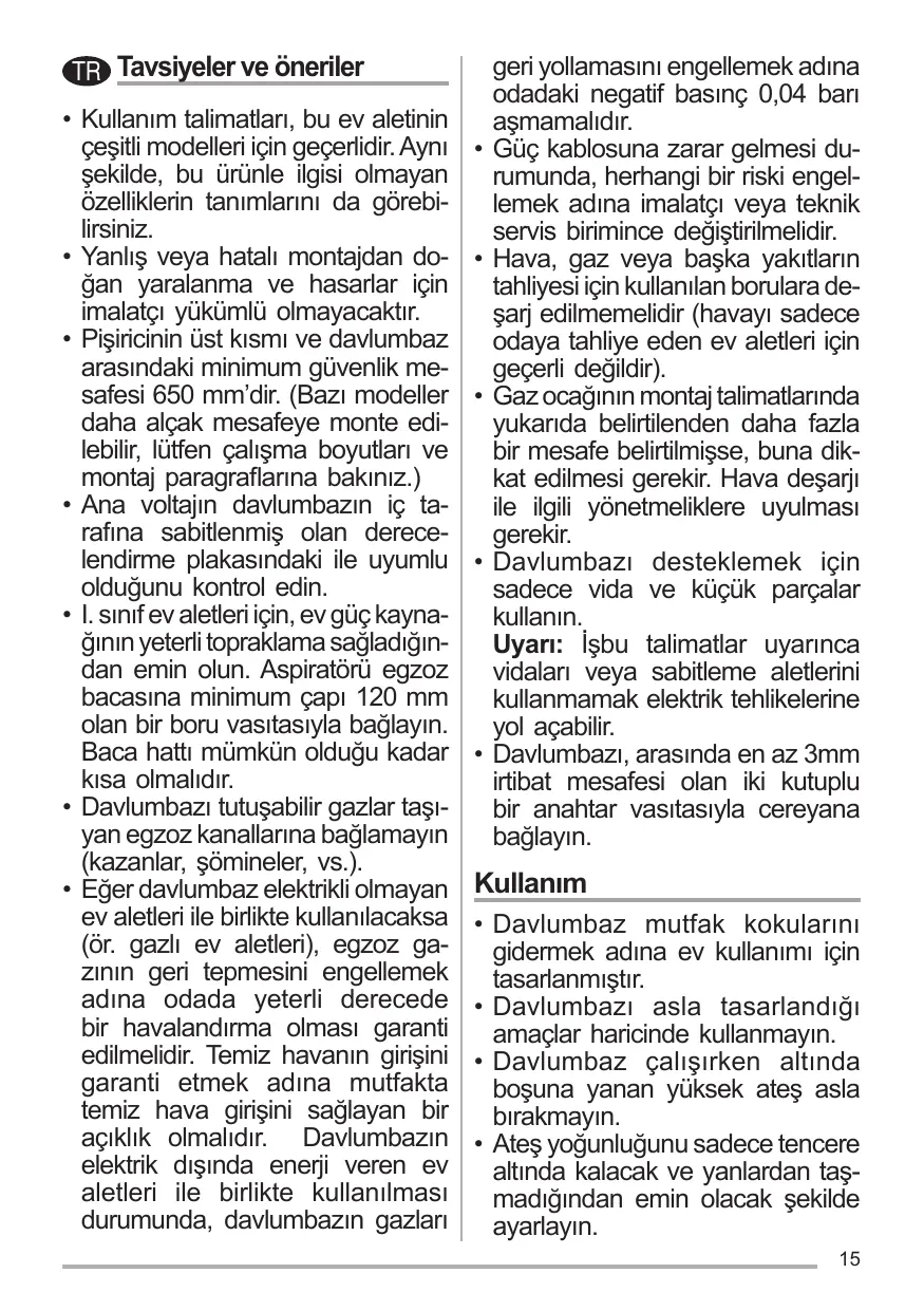 Ne pas évacuer l’air à travers un tube flexible utilisé pour l’aspiration des fumées des appareils alimentés au gaz ou avec d’autres combustibles (ne pas utiliser avec des appareils ayant une seule sortie d’air dans la pièce).
