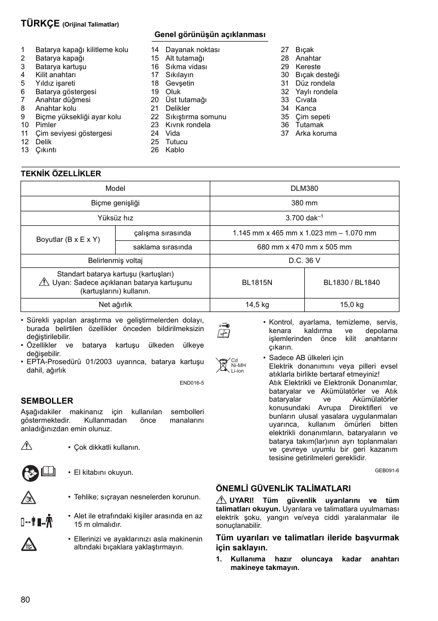 Téléchargez la notice de votre çim biçme makinesi au format PDF gratuitement ! Retrouvez votre notice LM381DZ - MAKITA et reprennez votre appareil électronique en main. Sur cette page sont publiés tous les documents nécessaires à l'utilisation de votre appareil LM381DZ de la marque MAKITA.