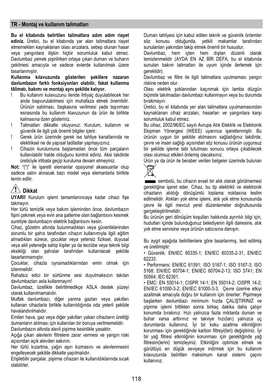 TR - Montaj ve kullanım talimatları Bu el kitabında belirtilen talimatlara adım adım riayet ediniz. Üretici, bu el kitabında yar alan talimatlara riayet etmemekten kaynaklanan olası arızalara, sebep olunan hasar veya yangınlara ilişkin hiçbir sorumluluk kabul etmez. Davlumbaz yemek pişirilirken ortaya çıkan duman ve buharın çekilmesi amacıyla ve sadece evlerde kullanılmak üzere tasarlanmıştır. Kullanma kılavuzunda gösterilen şekillere nazaran davlumbazın farklı fonksiyonları olabilir, fakat kullanma tâlimatı, bakımı ve montajı aynı şekilde kalıyor. Bu kullanım kulavuzunu ileride ihtiyaç duyulabilecek her anda başvurulabilmesi için muhafaza etmek önemlidir. Ürünün satılması, başkasına verilmesi yada taşınması esnasında bu kullanım klavuzunun da ürün ile birlikte kalmasına özen gösteriniz. Talimatları dikkatle okuyunuz: Kurulum, kullanım ve güvenlik ile ilgili çok önemli bilgiler içerir. Gerek ürün üzerinde gerek ise tahliye kanallarında ne elektriksel ne de yapısal tadilatlar yapmayızınız. Cihazin kurulumuna başlamadan önce tüm parçaların kullanılabilir halde olduğunu kontrol ediniz. Aksi takdirde üreticiyle irtibata geçip kuruluma devam etmeyiniz. Not: “(*)” ile işaretli elemanlar opsiyonel aksesuarlar olup sadece satın alınacak bazı model veya elemanlarla birlikte temin edilir. Duman tahliyesi için kabul edilen teknik ve güvenlik önlemler söz konusu olduğunda, yetkili makamlar tarafından sunulanları yakından takip etmek önemli bir husustur. Davlumbaz, hem içten hem dıştan düzenli olarak temizlenmelidir (AYDA EN AZ BİR DEFA, bu el kitabında sunulan bakım talimatları ile uyum içinde ilerlemek için gereklidir). Davlumbaz ve filtre ile ilgili talimatlara uyulmaması yangın riskine neden olur. Olası elektrik şoklarından kaçınmak için lamba düzgün biçimde takılmadan davlumbazı kullanmayın veya bu durumda bırakmayın. Üretici, bu el kitabında yer alan talimatlara uyulmamasından kaynaklanan cihaz arızaları, hasarları ve yangınlara karşı sorumluluk kabul etmez. Bu cihaz, 2002/96/EC sayılı Avrupa Atık Elektrik ve Elektronik Ekipman Yönergesi (WEEE) uyarınca işaretlenmiştir. Bu ürünün uygun bir şekilde atılmasını sağladığınız takdirde, çevre ve insan sağlığı açısından söz konusu ürünün uygunsuz bir şekilde işleme tabi tutulması sonucu ortaya çıkabilecek olası olumsuz etkileri önlemiş olacaksınız. Ürün ya da ürün ile beraber verilen belgeler üzerinde bulunan sembolü, bu cihazın evsel bir atık olarak görülmemesi gerektiğine işaret eder. Cihaz, bu tip elektrikli ve elektronik cihazların atıldığı dönüşümlü toplama noktasına teslim edilmelidir. Atıkları yok etme işlemi, atık yok etme konusunda çevre ile ilgili mevcut yerel düzenlemeler doğrultusunda gerçekleştirilmelidir. Bu ürünün geri dönüşüm koşulları hakkında ayrıntılı bilgi için, hudutları içinde bulunduğunuz belediyenin ilgili dairesine, atık yok etme servisine veya ürünün satıcısına danışın. Dikkat UYARI! Kurulum işlemi tamamlanıncaya kadar cihazı fişe takmayın. Her türlü temizlik veya bakım işleminden önce, davlumbazın fişini çekmek veya evin ana şalterine olan bağlantısını kesmek suretiyle davlumbazın elektrik bağlantısını kesin. Cihaz, gözetim altında bulunmadıkları veya güvenliklerinden sorumlu bir şahıs tarafından cihazın kullanımıyla ilgili eğitim almadıkları sürece, çocuklar veya yetersiz fiziksel, duyusal veya akli yeteneğe sahip kişiler ya da tecrübe veya teknik bilgi eksikliği olan şahıslar tarafından kullanılacak şekilde tasarlanmamıştır. Çocuklar, cihazla oynamadıklarından emin olmak için izlenmelidir. Rahatsız edici bir sürtünme sesi duyulmaksızın takılan davlumbazları asla kullanmayın! Davlumbaz, özellikle belirtilmedikçe ASLA destek yüzeyi olarak kullanılmamalıdır. Mutfak davlumbazı, diğer yanma gazları veya yakıtları kullanan cihazlarla birlikte kullanıldığında oda yeterli şekilde havalandırılmalıdır. Emilen hava, gaz veya diğer yakıtları yakan cihazların ürettiği dumanların atılması için kullanılan bir boruya verilmemelidir. Davlumbazın altında alevli pişirme kesinlikle yasaktır. Açığa çıkan alevlerin filtrelere zarar vermesi ve yangın riski açısından açık alevden sakının. Her türlü kızartma, yağın aşırı kızmasını ve alevlenmesini engelleyecek şekilde dikkatle yapılmalıdır. Erişilebilir parçalar, pişirme cihazarı ile kullanıldıklarında sıcak olabilirler. Bu aygıt aşağıda belirtilenlere göre tasarlanmış, test edilmiş ve üretilmiştir: